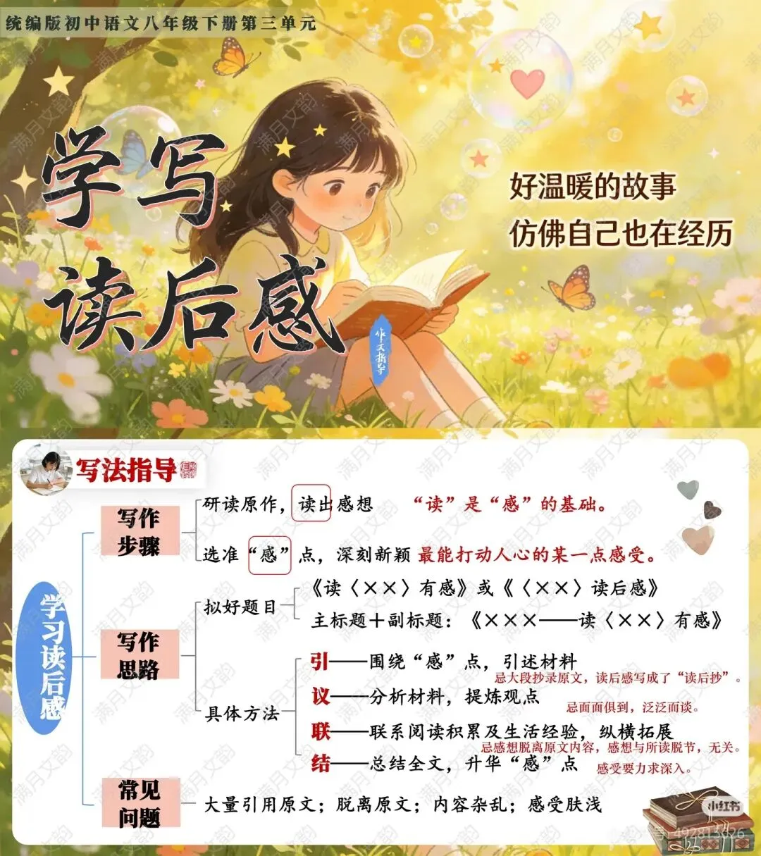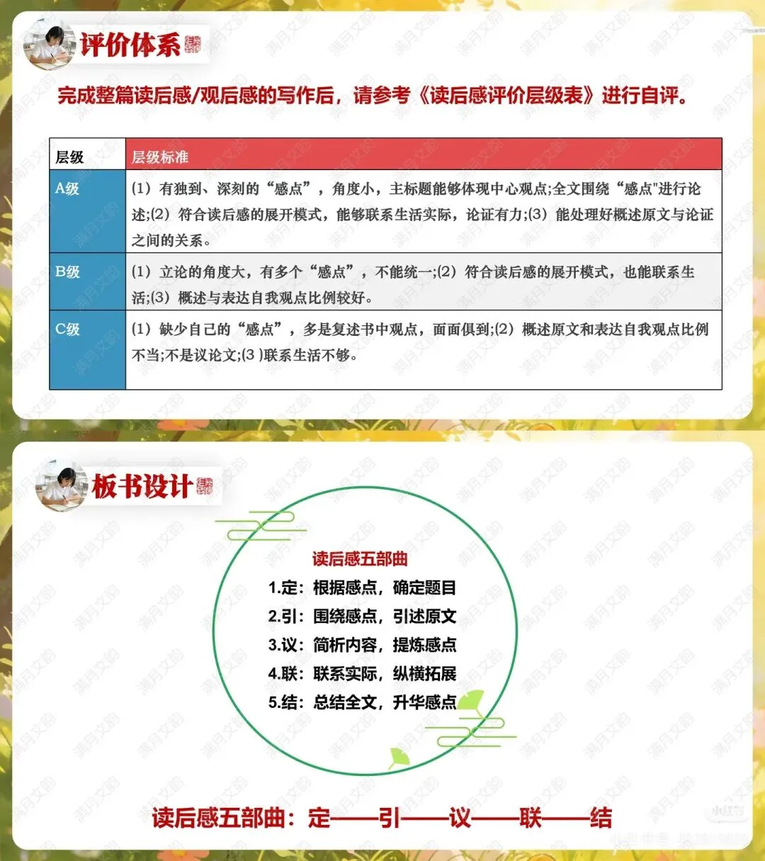 课堂总结:以板书“读后感五部曲”(定、引、议、联、结) 清晰归纳核心写作框架。