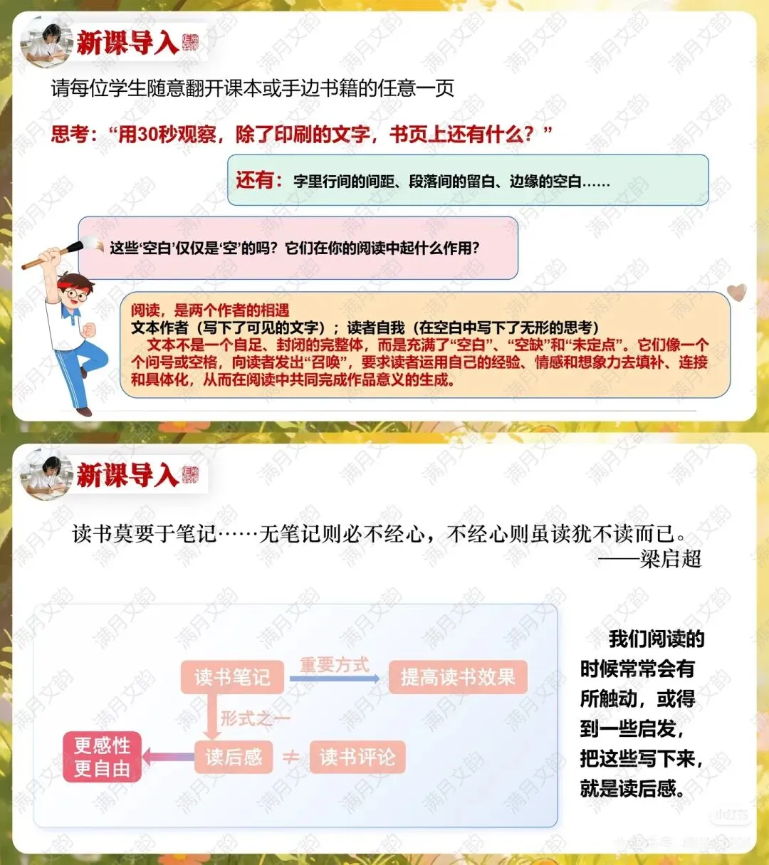 引导学生观察书本上的“空白处”,通过问题“除了印刷的文字,书页上还有什么?”启发学生发现“空白”,进而理解阅读是读者与作者的共同创作。引用梁启超“读书莫要于笔记”之言,自然引出“读后感”的概念。