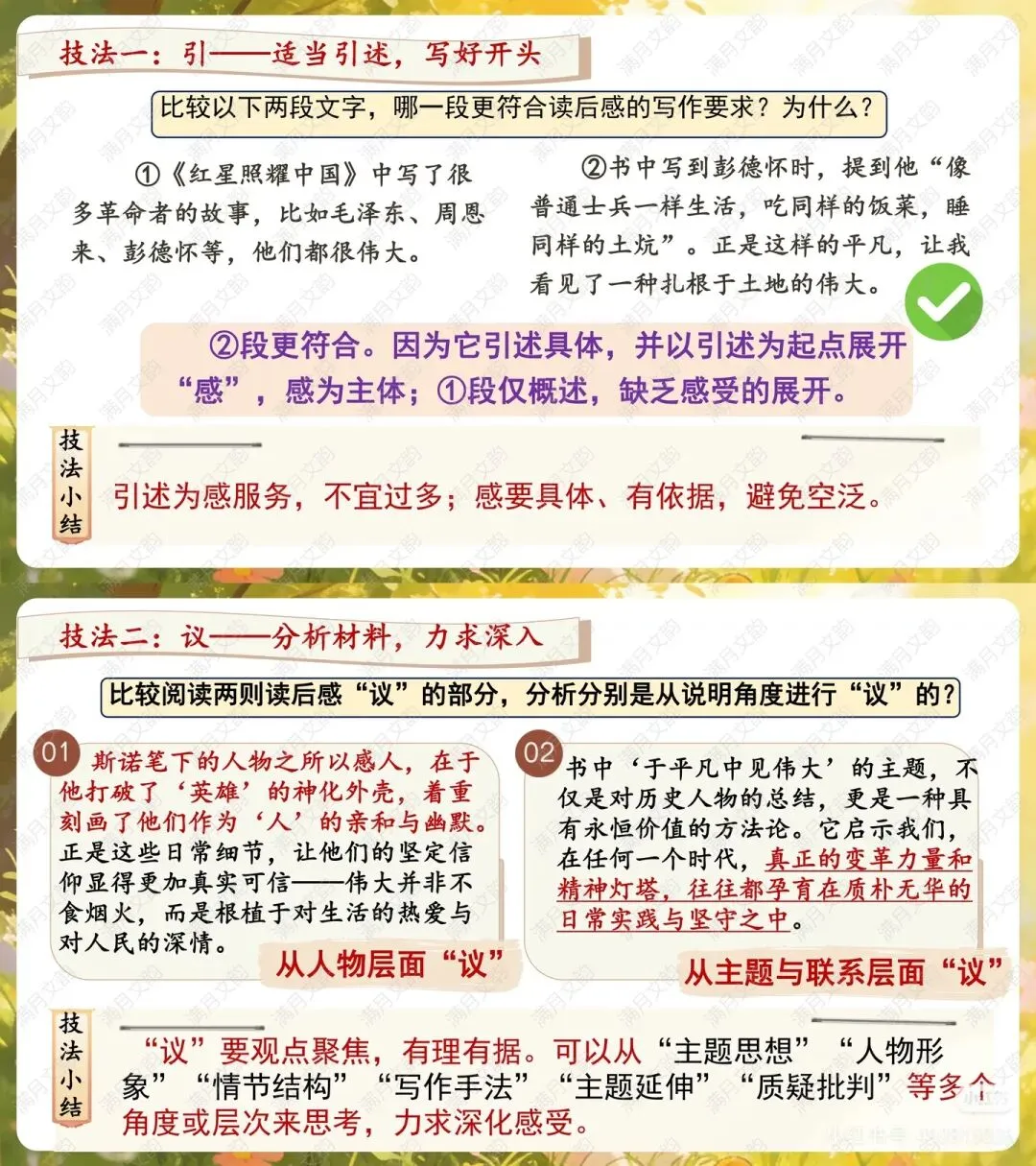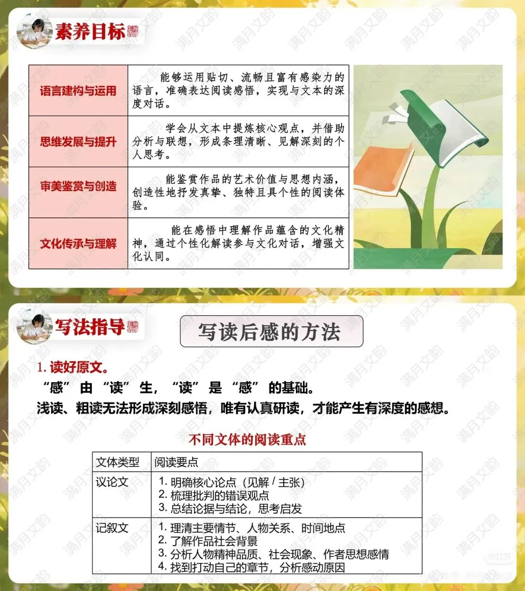 读好原文:强调“感”以“读”为本,需认真研读,并根据不同文体(如小说、散文、诗歌)把握阅读重点。