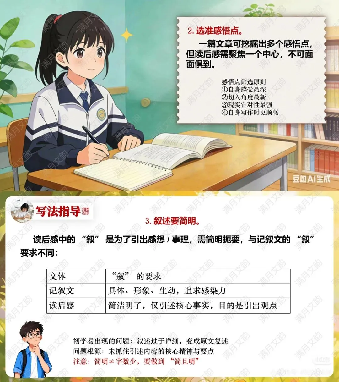 叙述要简明:明确“叙”为“感”服务,需抓住原文核心要点进行概括,避免冗长复述,做到“简且明”。