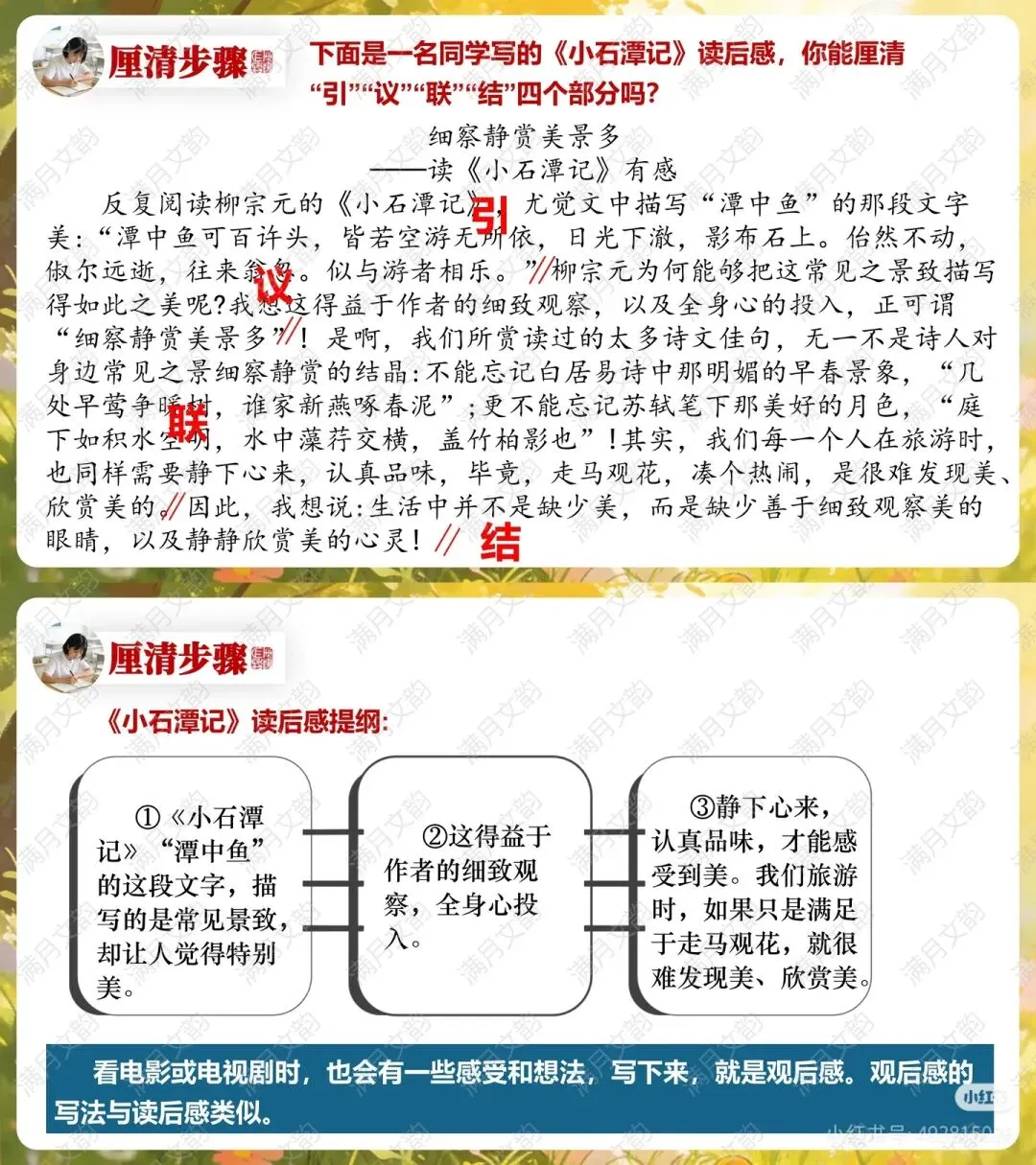 分析范例《<小石潭记>读后感》,引导学生厘清读后感“引、议、联、结”四部分的构成。
