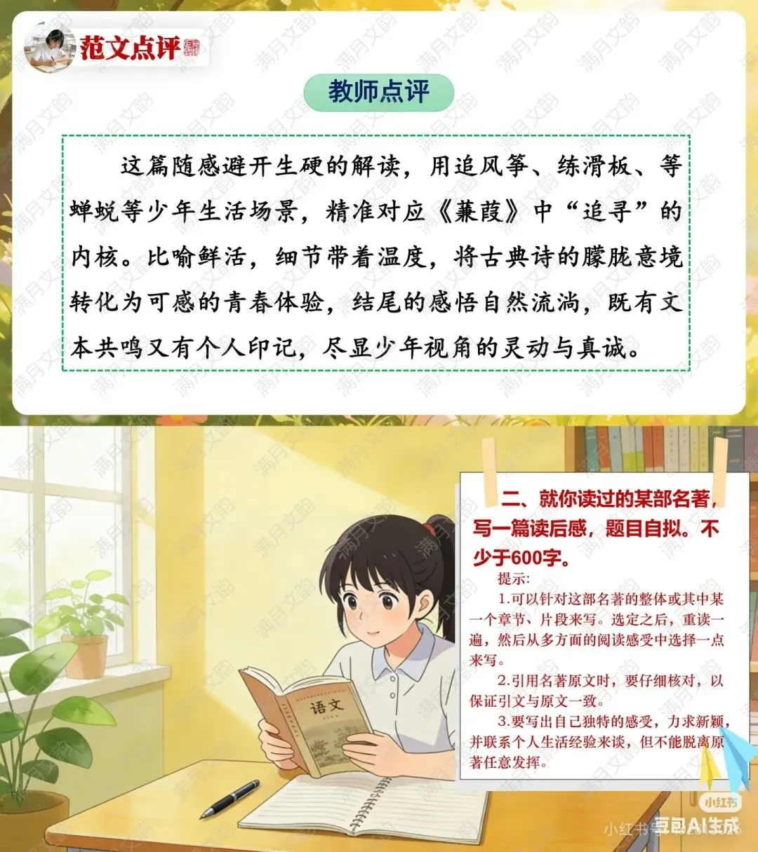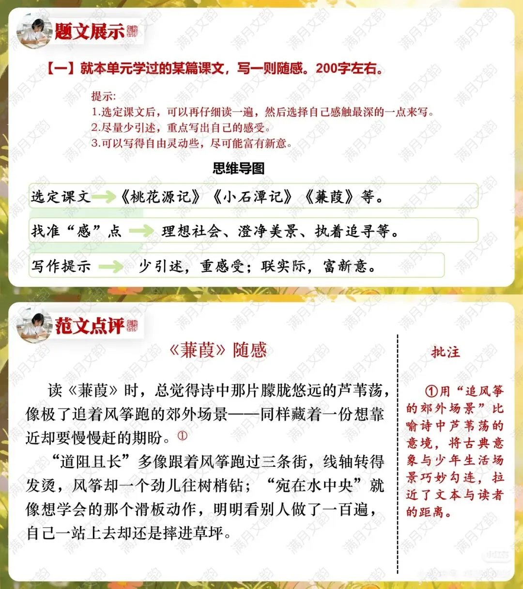 【任务一】课文随感:就本单元课文(如《桃花源记》《蒹葭》)写200字左右随感,强调“少引述,重感受”、“联实际,富新意”。范文《<蒹葭>随感》以追风筝、练滑板等少年生活场景比喻诗中的追寻,展现了将古典意境转化为鲜活个人体验的范例。