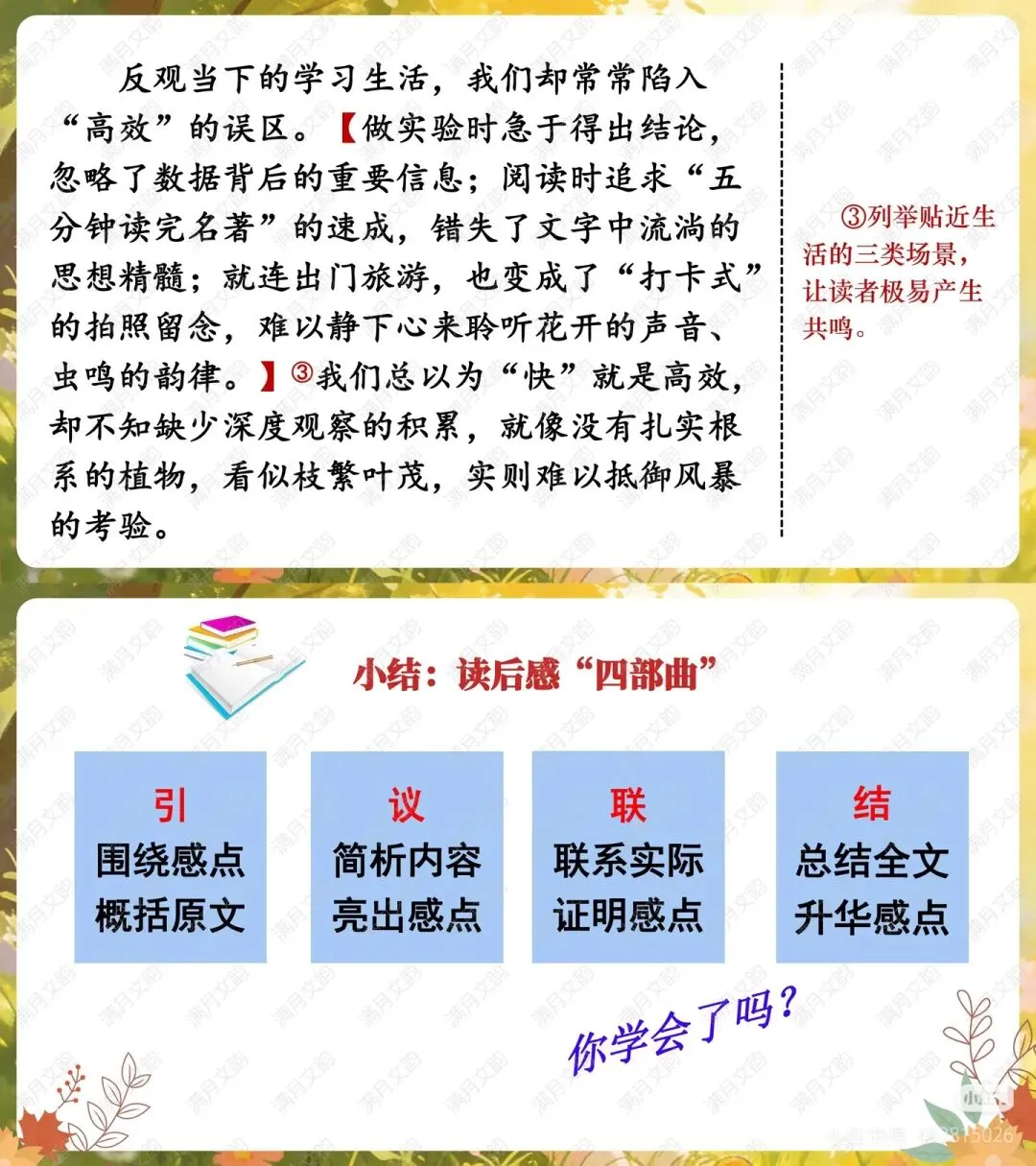 本环节重点讲解撰写读后感的四个关键方法: