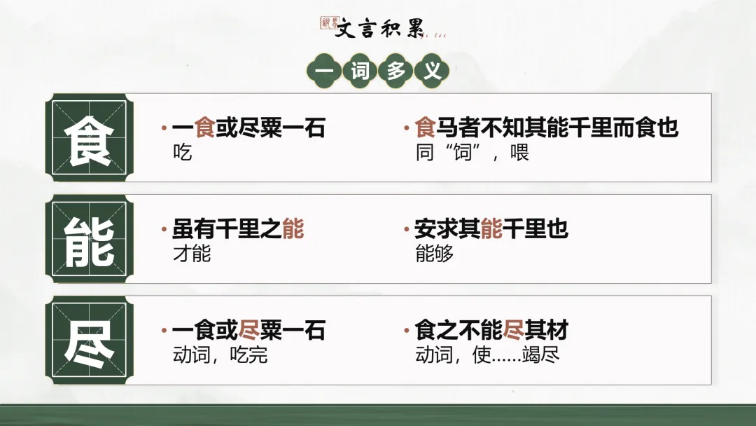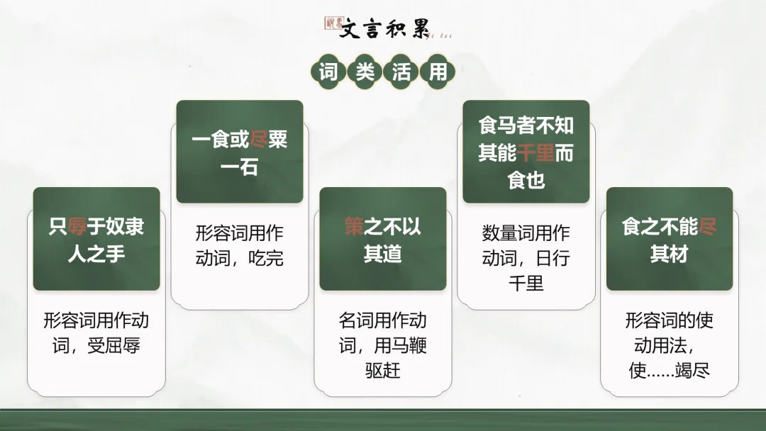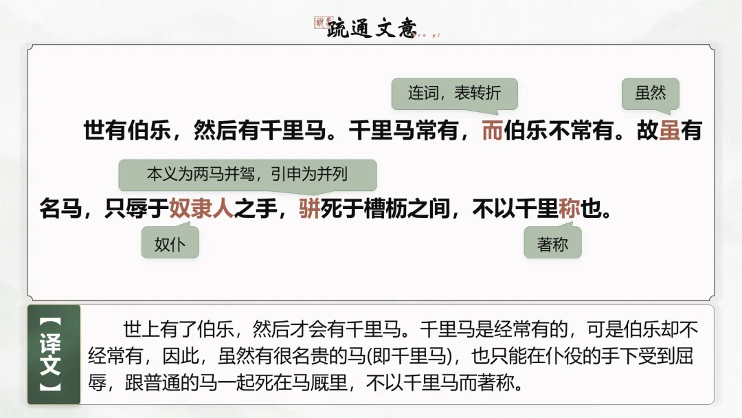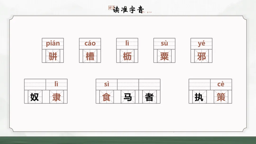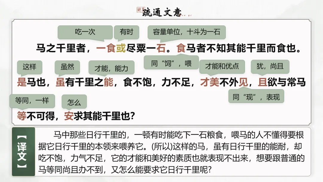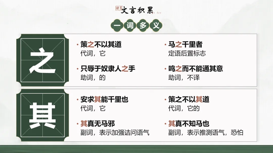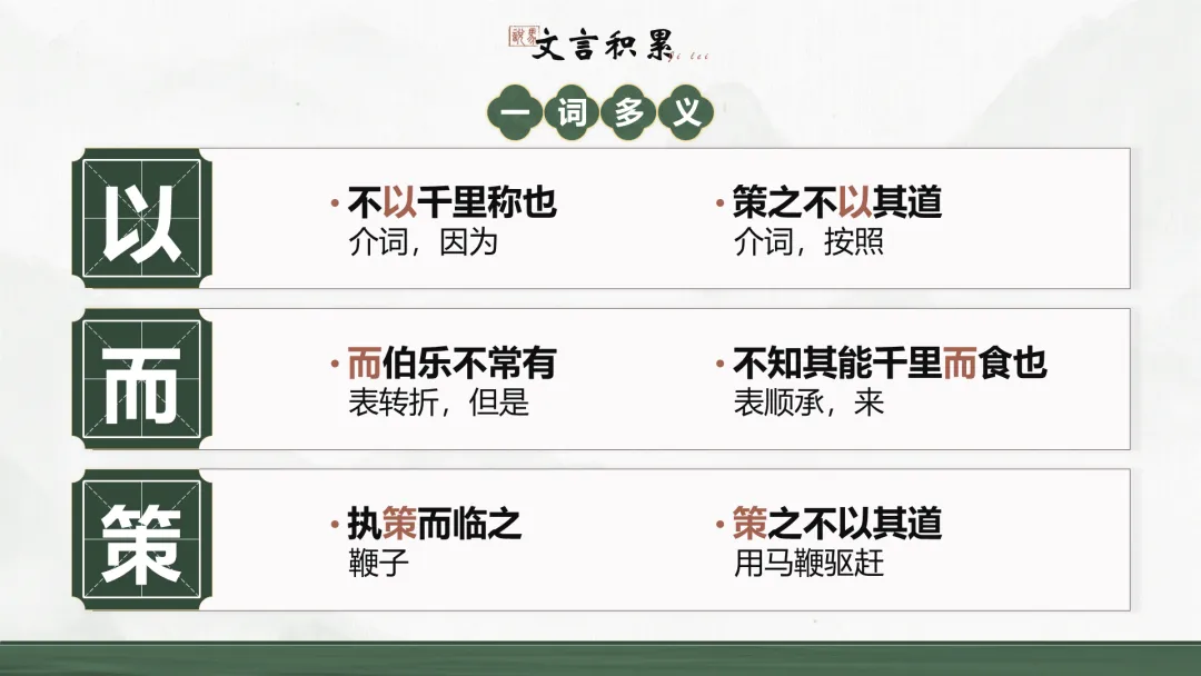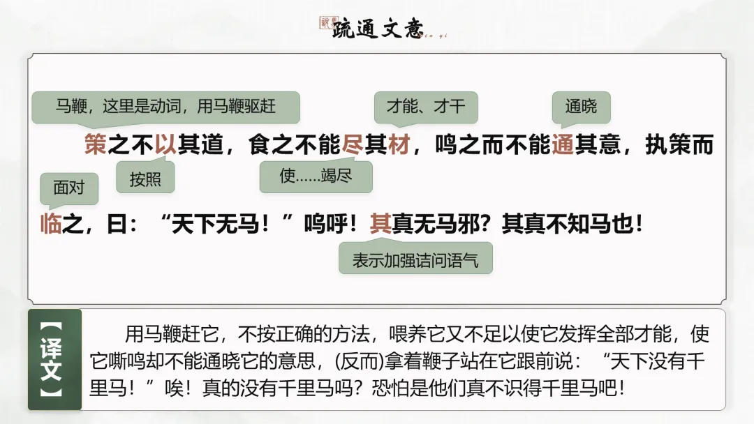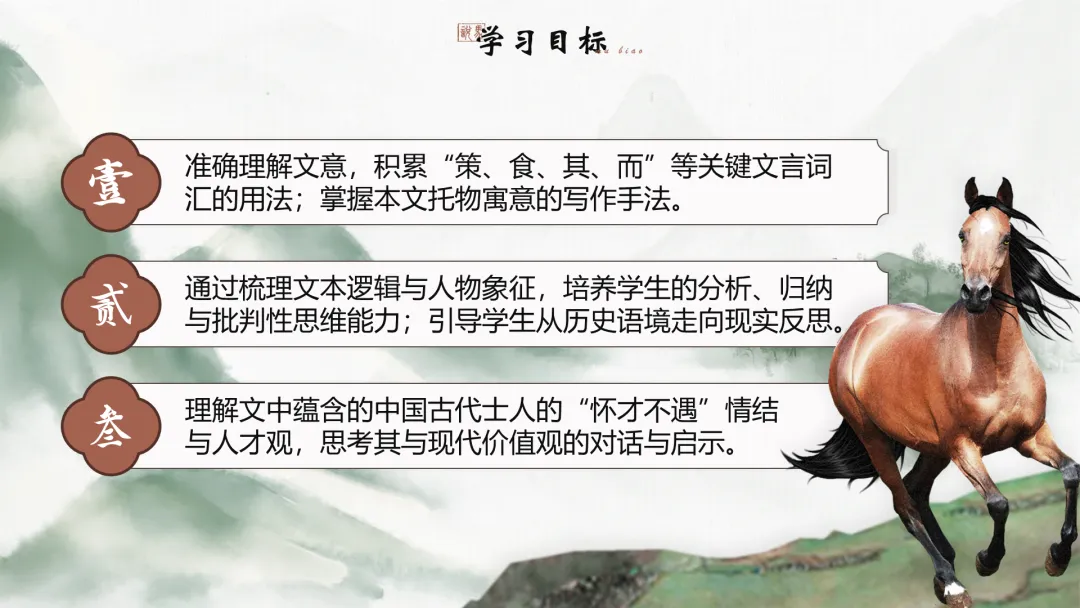 1. 准确理解文意,积累“策、食、其、而”等关键文言词汇的用法;掌握本文托物寓意的写作手法。