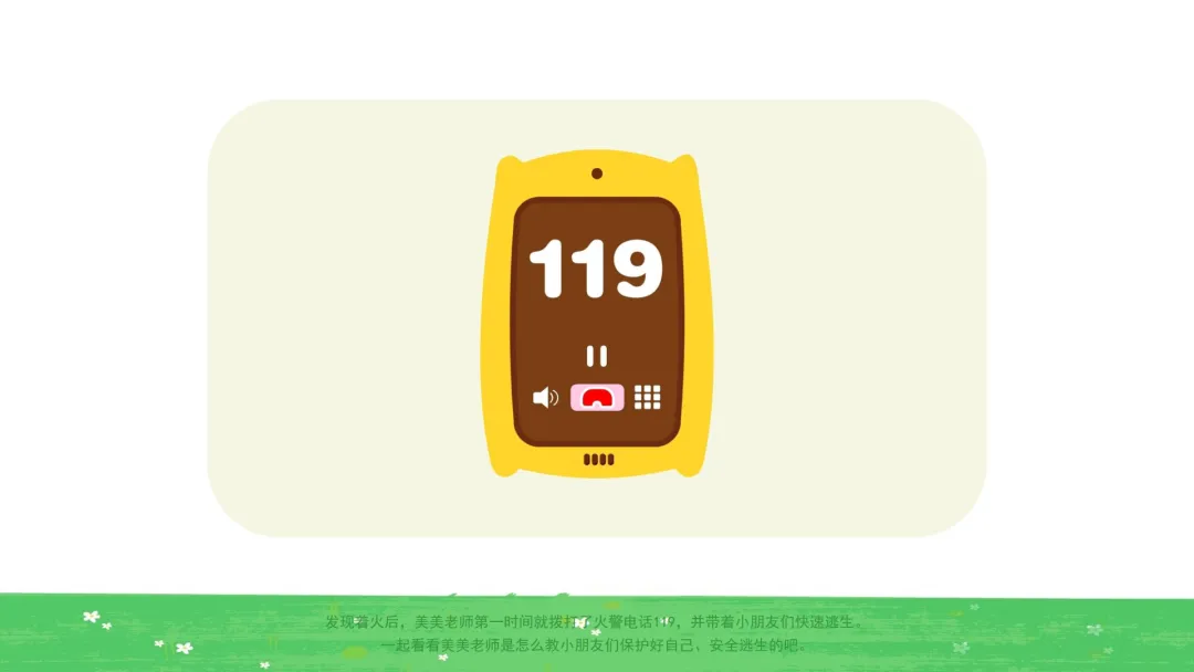 ——发现着火后,美美老师第一时间就拨打了火警电话119,并带着小朋友们快速逃生。