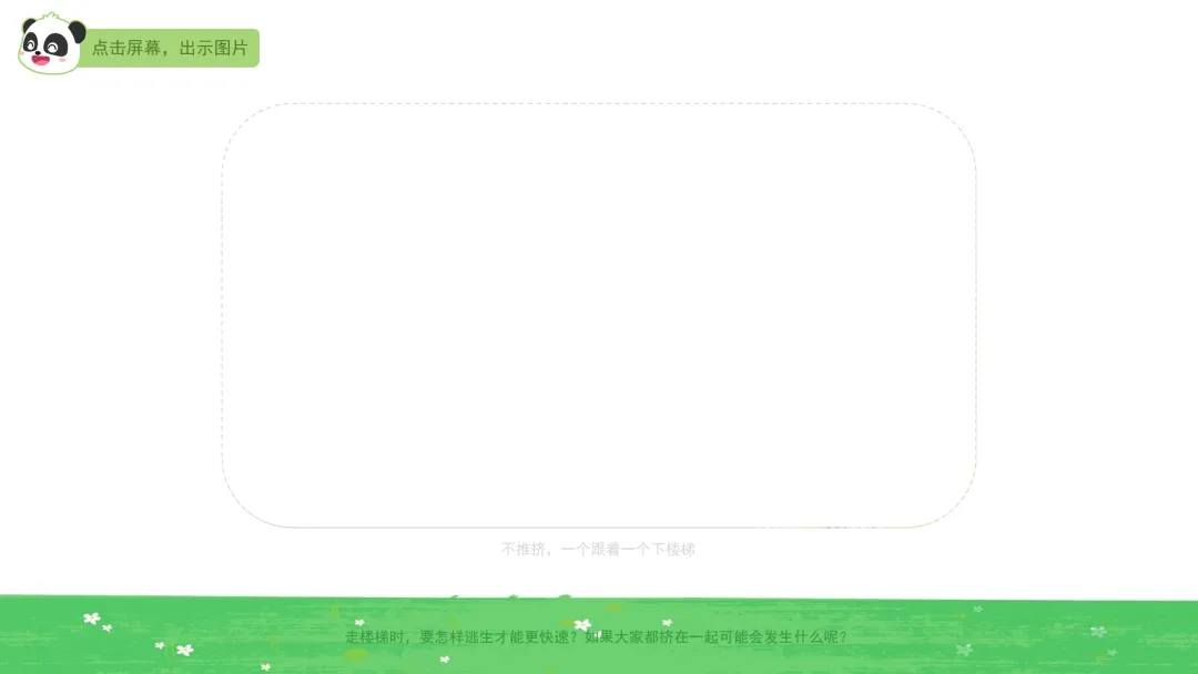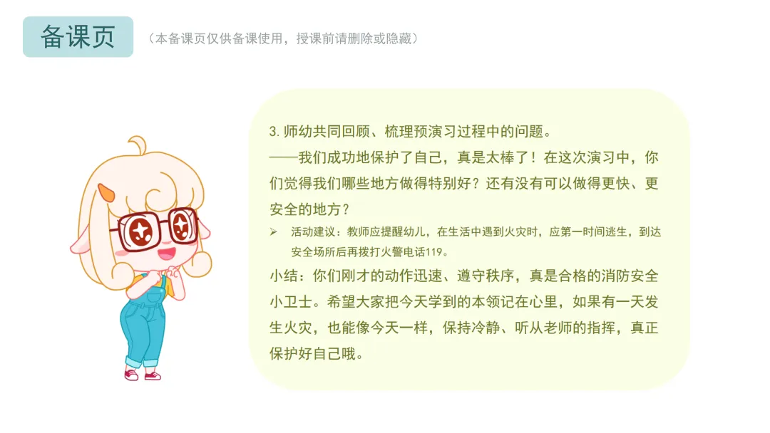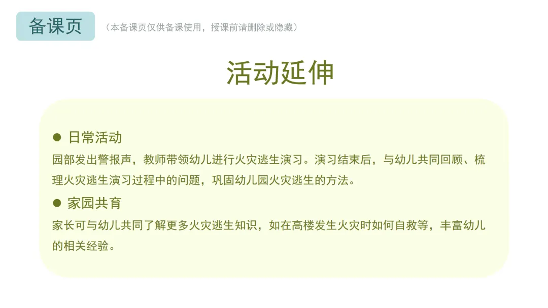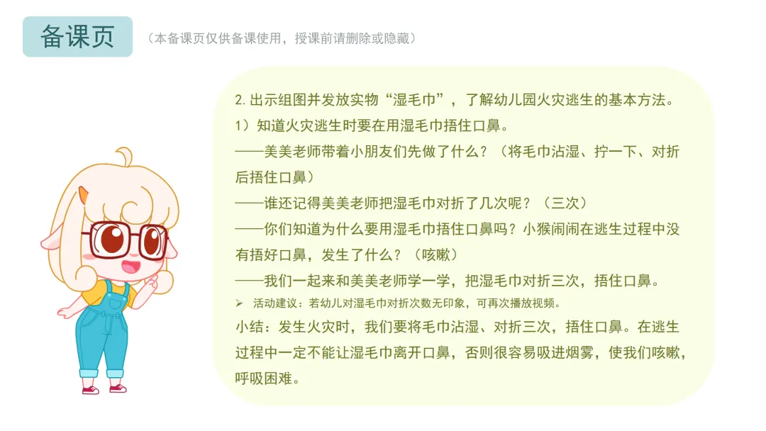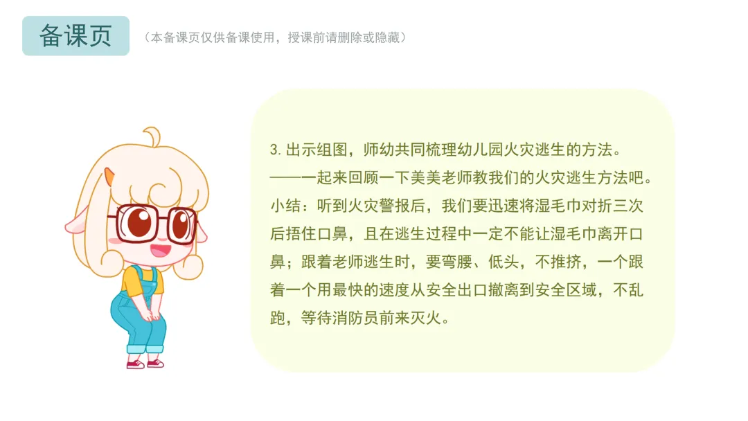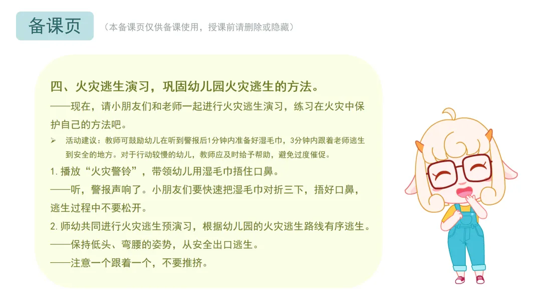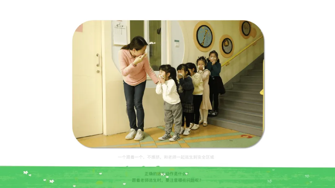Ø活动建议:教师可鼓励幼儿在听到警报后1分钟内准备好湿毛巾,3分钟内跟着老师逃生到安全的地方。对于行动较慢的幼儿,教师应及时给予帮助,避免过度催促。