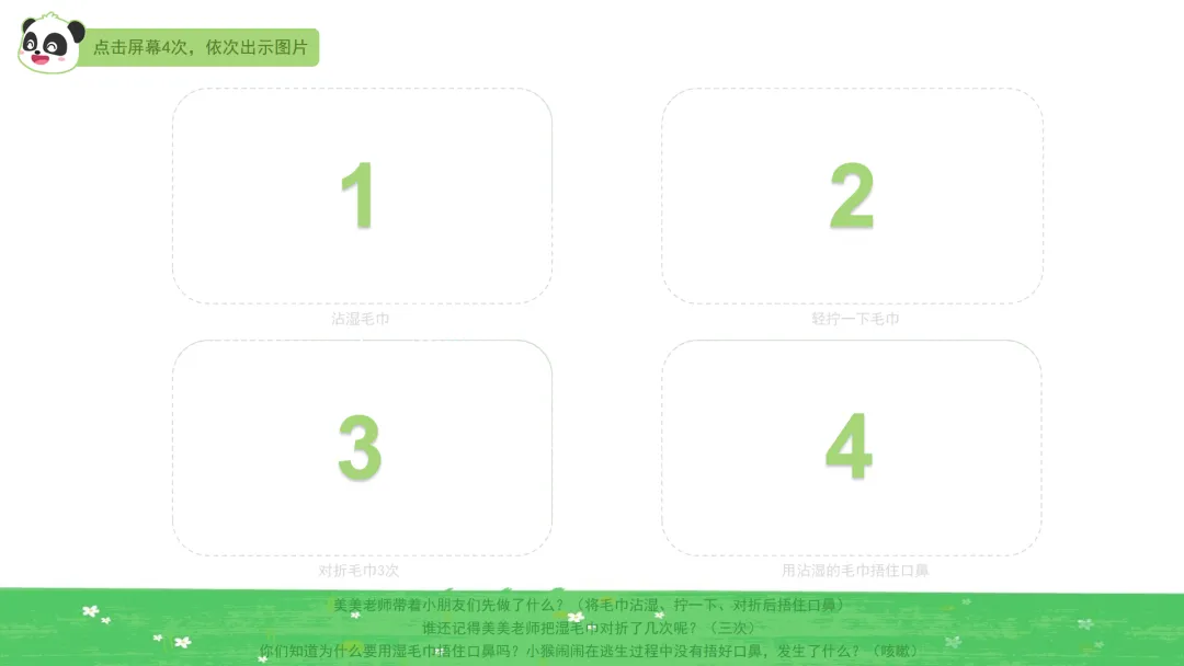 ——美美老师带着小朋友们先做了什么?(将毛巾沾湿、对折,捂住口鼻)