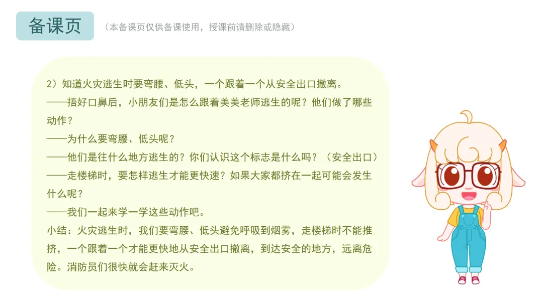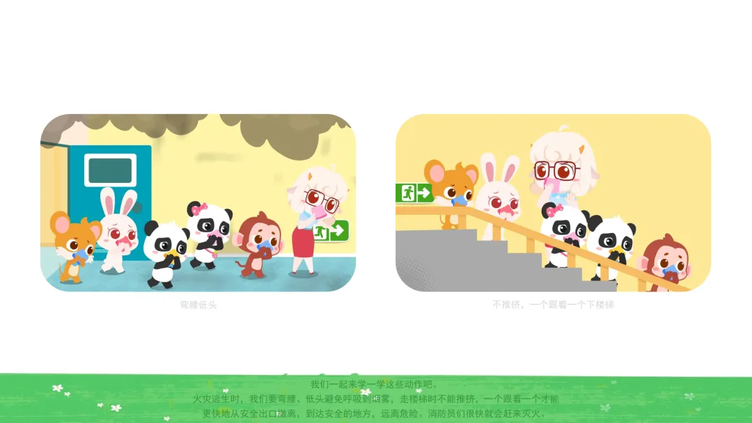小结:火灾逃生时,我们要弯腰、低头避免呼吸到烟雾,走楼梯时不能推挤,一个跟着一个才能更快地从安全出口撤离,到达安全的地方,远离危险。消防员们很快就会赶来灭火。