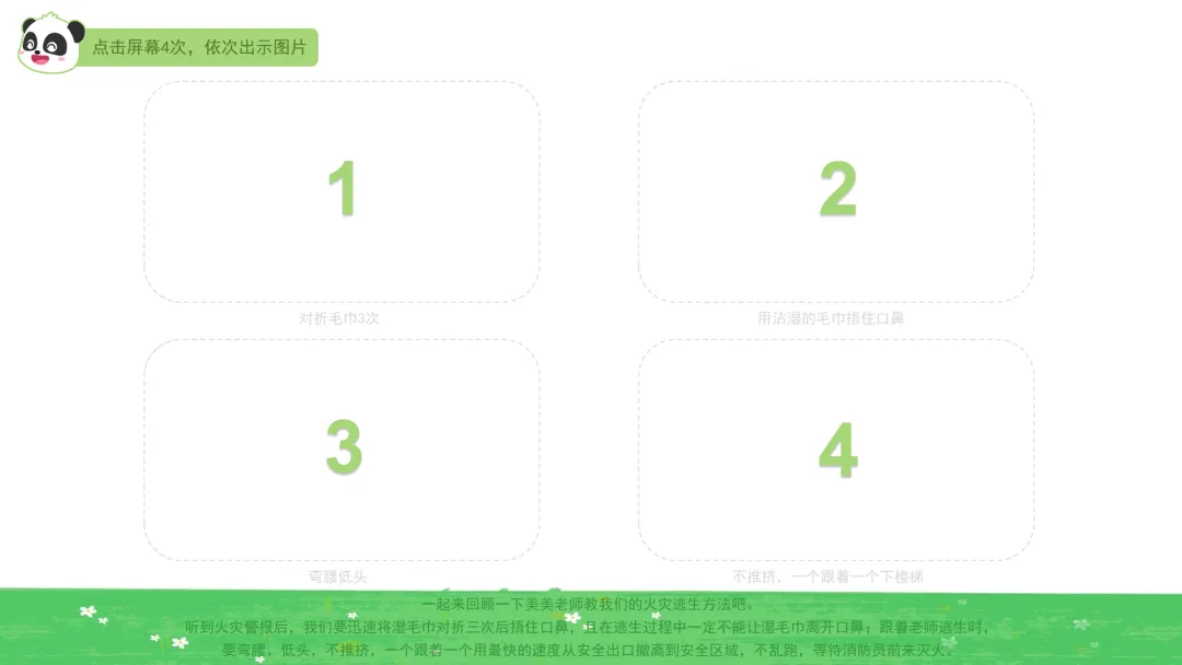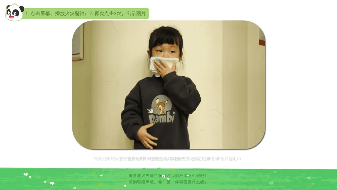 ——听,警报声响了。小朋友们要快速把湿毛巾对折三下,捂好口鼻,逃生过程中不要松开。