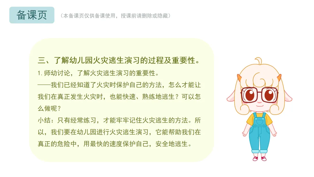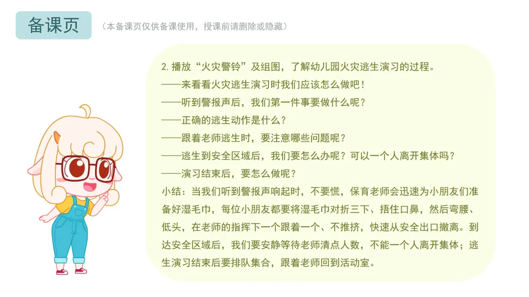——现在,请小朋友们和老师一起进行火灾逃生演习,练习在火灾中保护自己的方法吧。