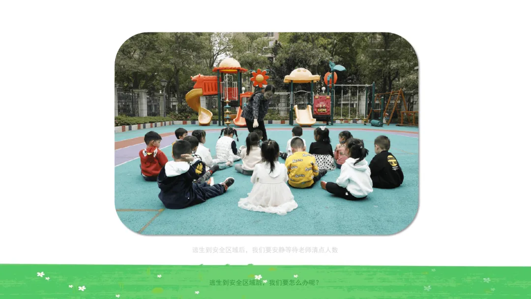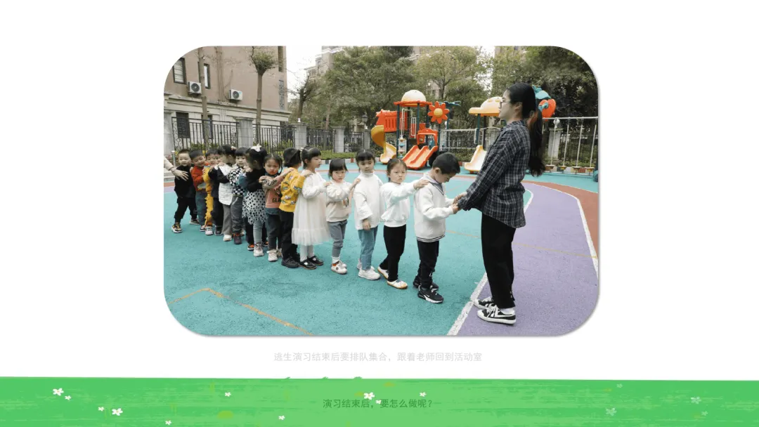 小结:当我们听到警报声响起时,不要慌,保育老师会迅速为小朋友们准备好湿毛巾,每位小朋友都要将湿毛巾对折三下、捂住口鼻,然后弯腰、低头,在老师的指挥下一个跟着一个、不推挤,快速从安全出口撤离。到达安全区域后,我们要安静等待老师清点人数,不能一个人离开集体;逃生演习结束后要排队集合,跟着老师回到活动室。