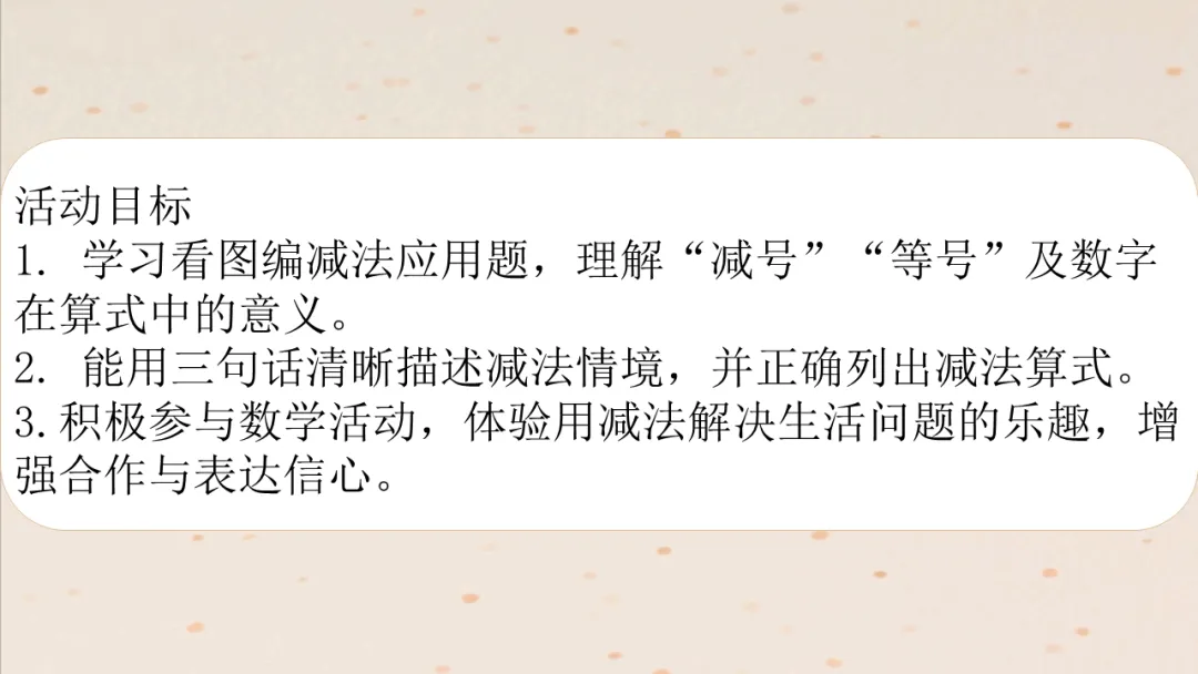 3. 情感目标:积极参与数学活动,体验用减法解决生活问题的乐趣,增强合作与表达信心。