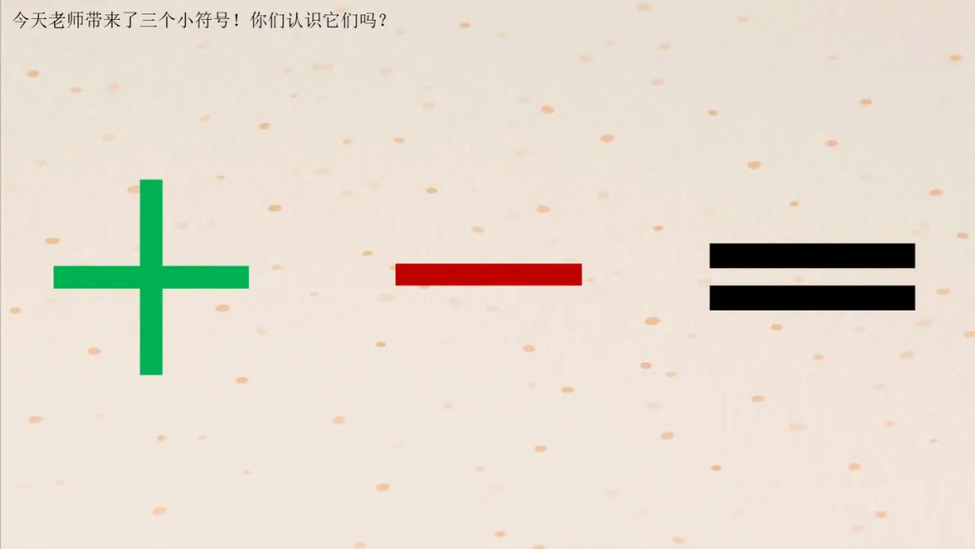 教师出示“减号➖”“等号=”“加号+”卡片,提问:“这三个符号谁见过?你们认识不认识它们?知道它们表示什么吗?