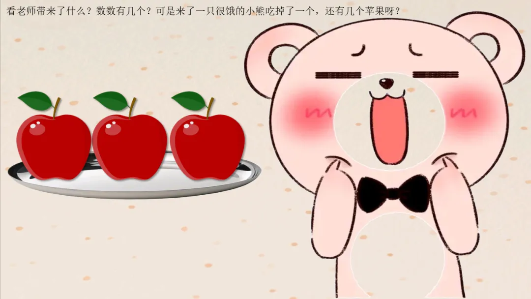 PPT展示:盘子里有3个苹果→ 一只很饿的小熊吃掉1个→ 剩余2个
