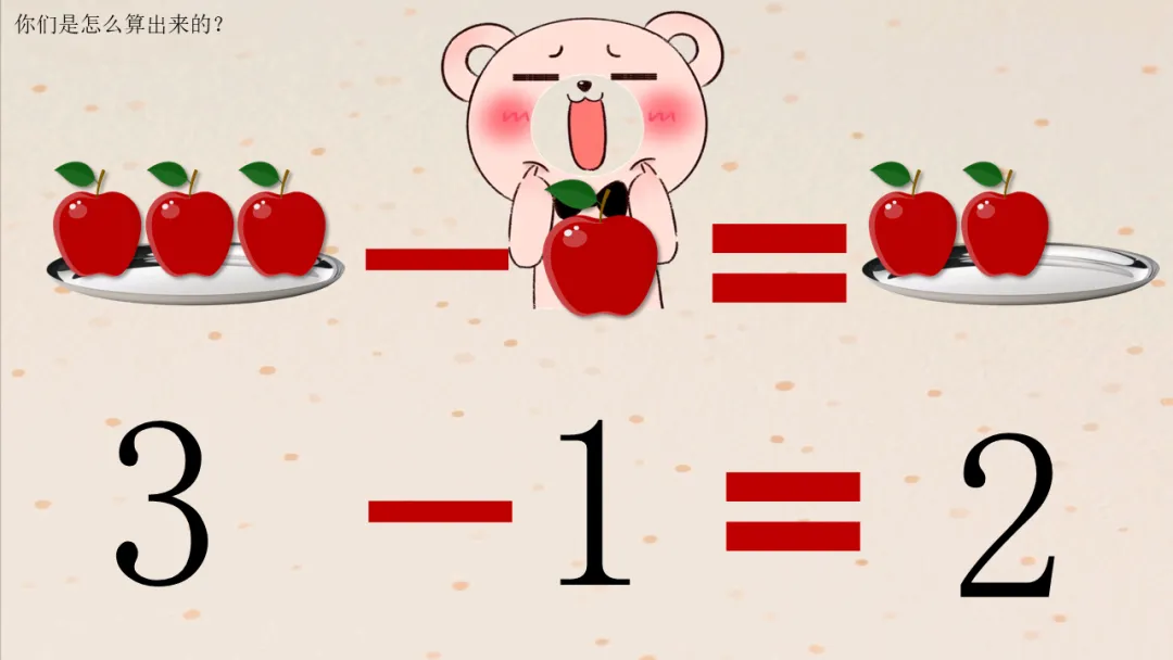 解释:“3是原来的苹果,1是被吃掉的,2是剩下的;减号➖表示吃掉,等号=表示结果。”
