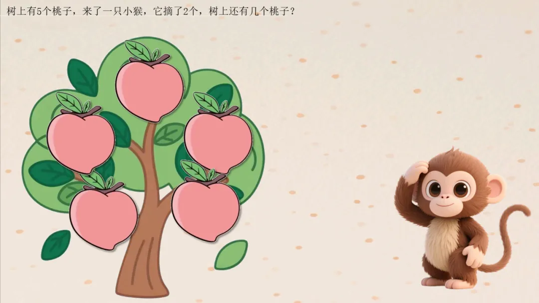 PPT展示:树上有5个桃子(静态图)→ 小猴摘走2个(动态“右移”效果)→ 剩余3个