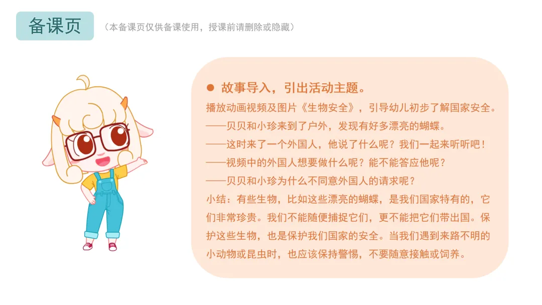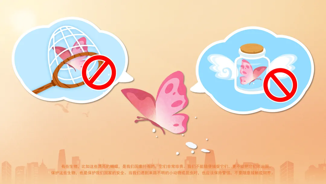 小结:有些生物,比如这些漂亮的蝴蝶,是我们国家特有的,它们非常珍贵。我们不能随便捕捉它们,更不能把它们带出国。保护这些生物,也是保护我们国家的安全。当我们遇到来路不明的小动物或昆虫时,也应该保持警惕,不要随意接触或饲养。