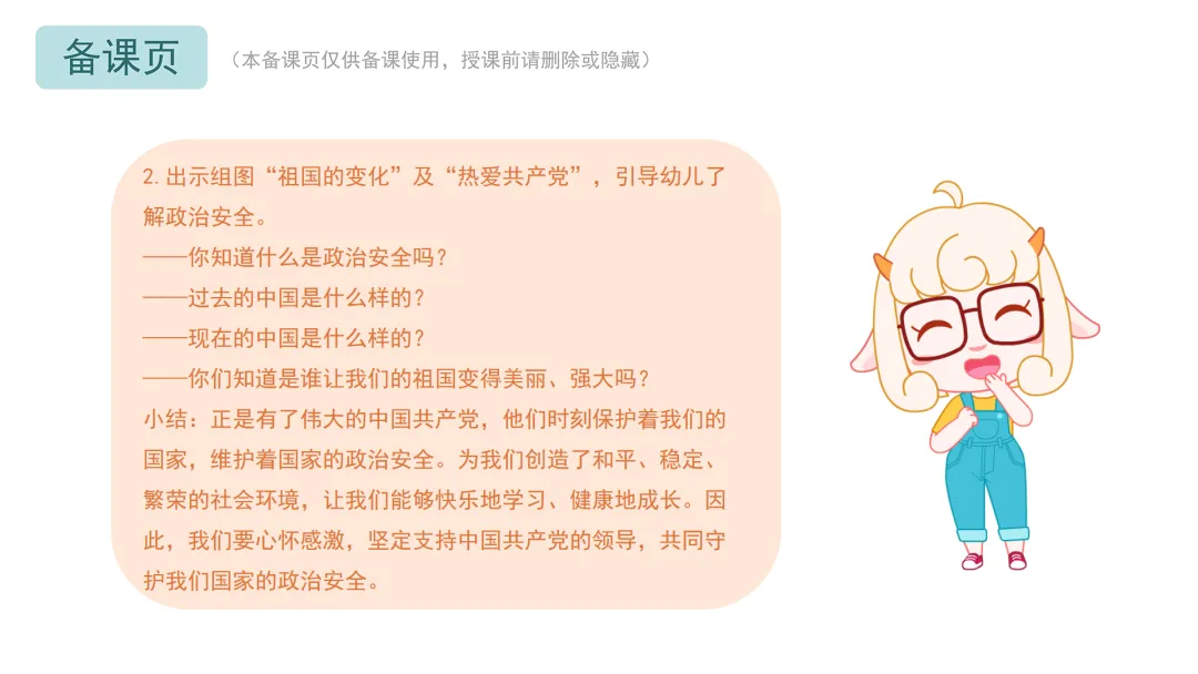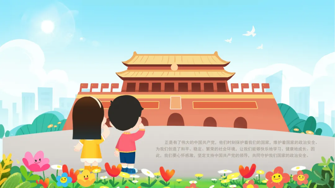 小结:正是有了伟大的中国共产党,他们时刻保护着我们的国家,维护着国家的政治安全。为我们创造了和平、稳定、繁荣的社会环境,让我们能够快乐地学习、健康地成长。因此,我们要心怀感激,坚定支持中国共产党的领导,共同守护我们国家的政治安全。