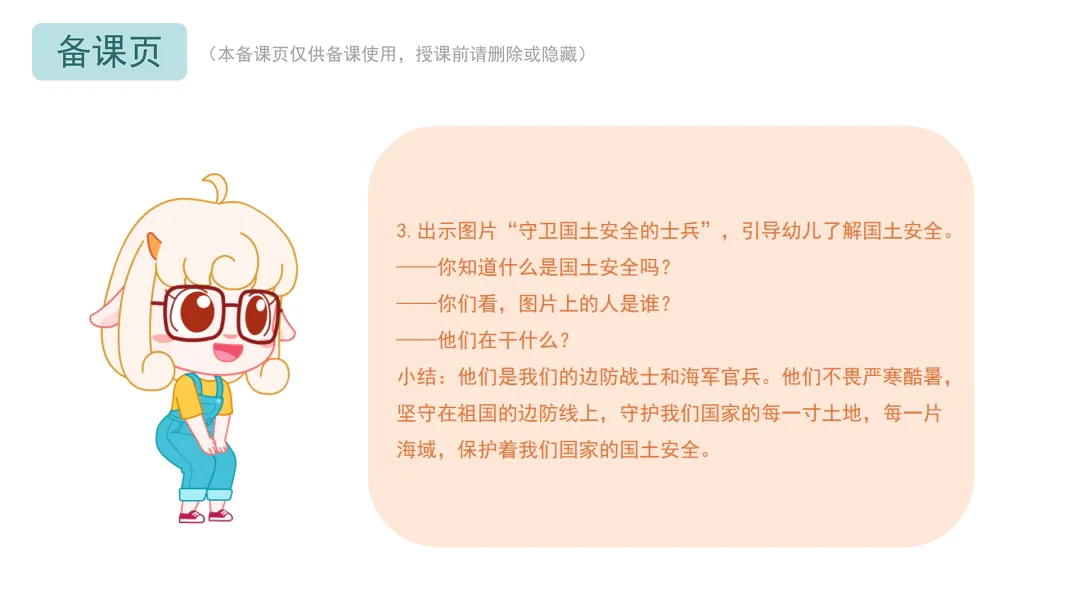 3.出示图片“守卫国土安全的士兵”,引导幼儿了解国土安全。