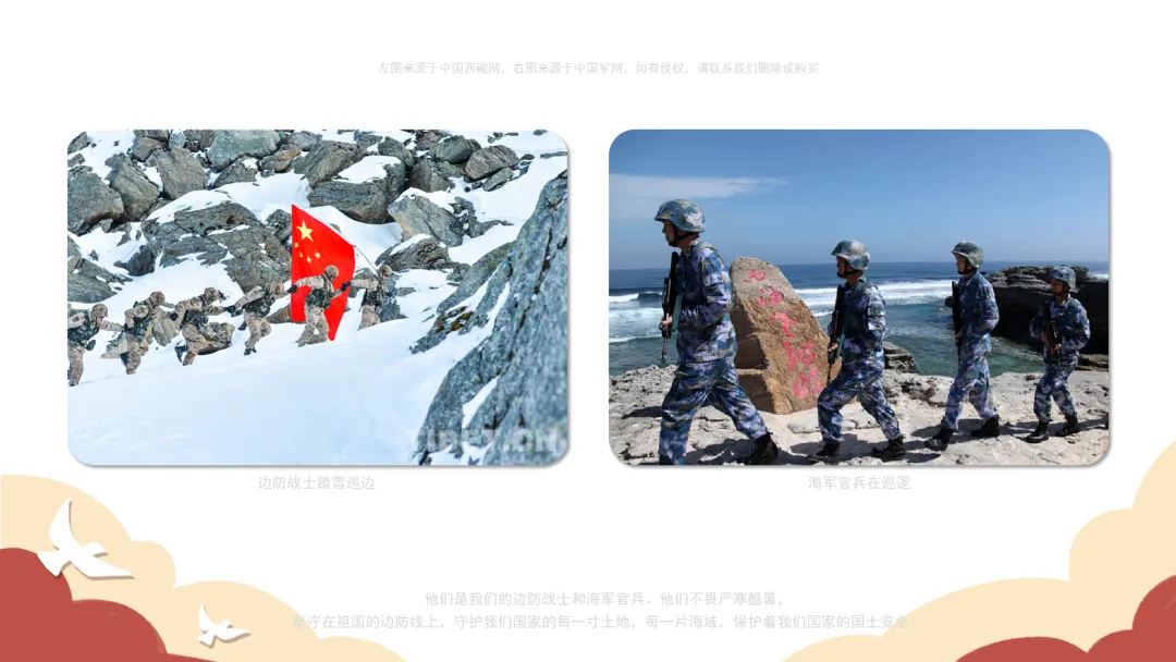 小结:他们是我们的边防战士和海军官兵。他们不畏严寒酷暑,坚守在祖国的边防线上,守护我们国家的每一寸土地,每一片海域,保护着我们国家的国土安全。