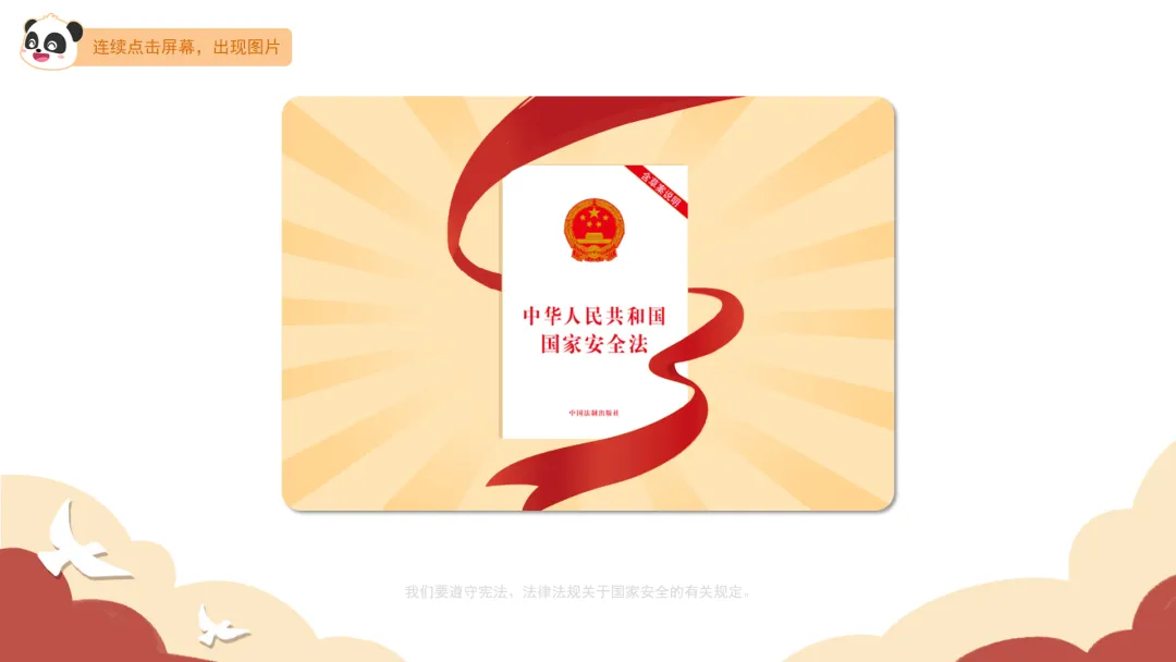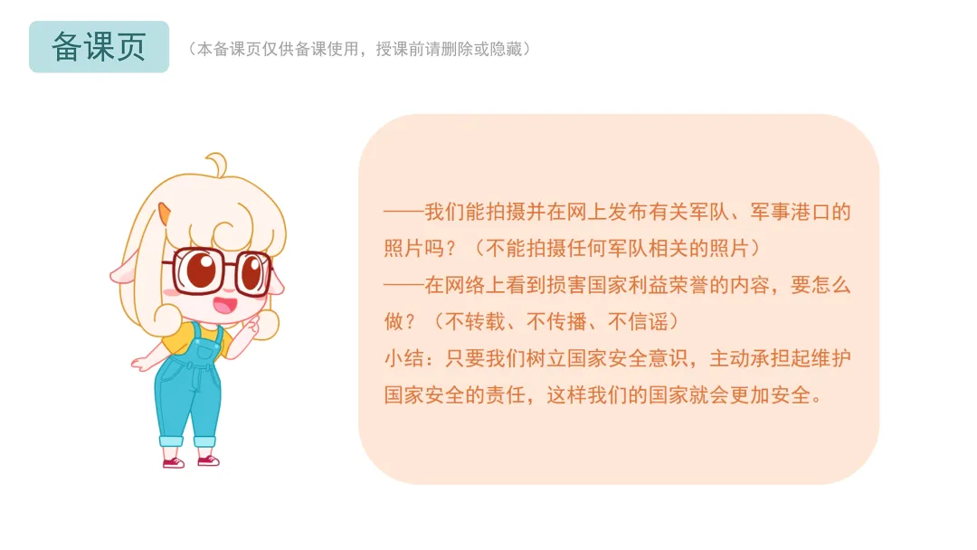 小结:只要我们树立国家安全意识,主动承担起维护国家安全的责任,这样我们的国家就会更加安全。