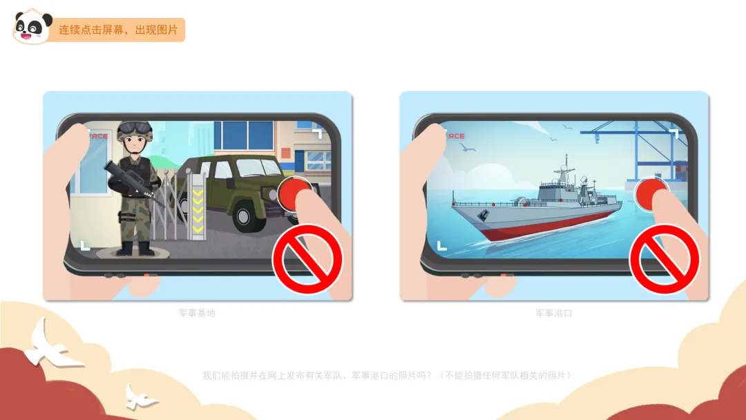 ——我们能拍摄并在网上发布有关军队、军事港口的照片吗?(不能拍摄任何军队的照片)