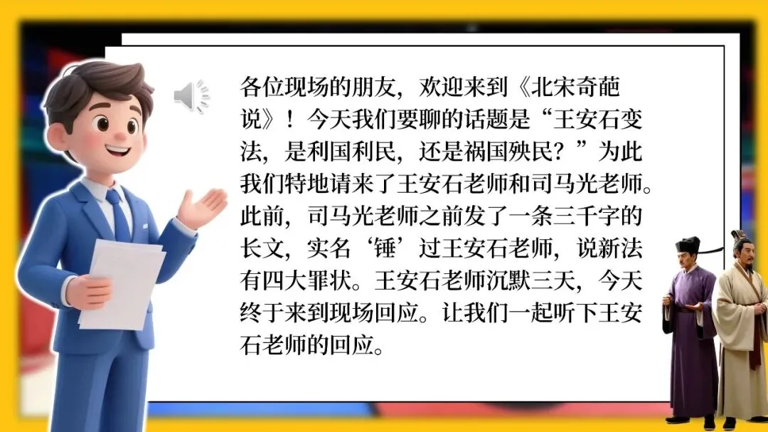 综艺《奇葩说·北宋篇》最新一期即将开录,本次我们邀请到的嘉宾是北宋政坛两大顶流,司马光@资治通鉴编辑部 和 王安石@青苗法不是贷(变法版),对于变法一事,两位嘉宾始终无法达成一致,今天我们在节目中就“王安石变法,是利国利民,还是祸国殃民?”进行自由辩论,各位观众将全程观赛,并进行投票,共同探讨对变法的看法。