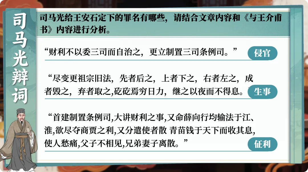 从“砸缸男孩”到“奇葩说北宋篇”,从“@资治通鉴编辑部”到引用《与王介甫书》的原文来还原司马光的控诉——这份设计在建构一个完整的语境,一个学生可以真正“进入”的语境。