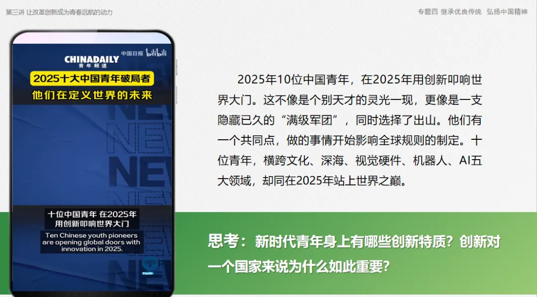 问题导入:以2025年十大青年用创新定义世界未来的视频作为引入,引导学生思考新时代青年身上的创新特质,了解我国科技创新的最新成就,引入新课。