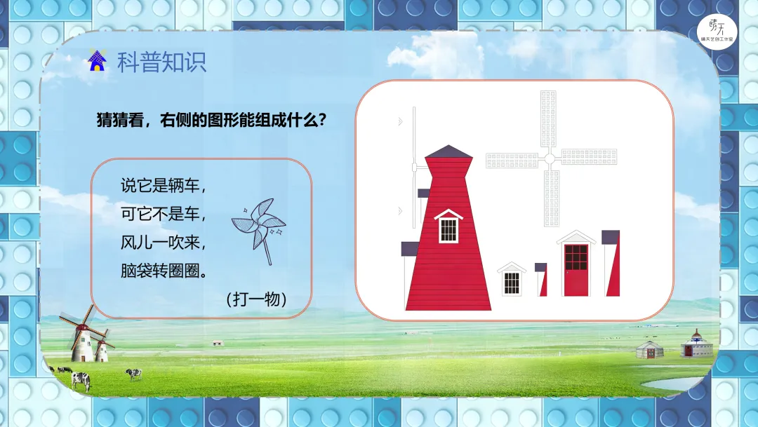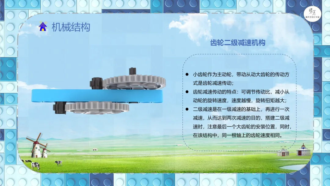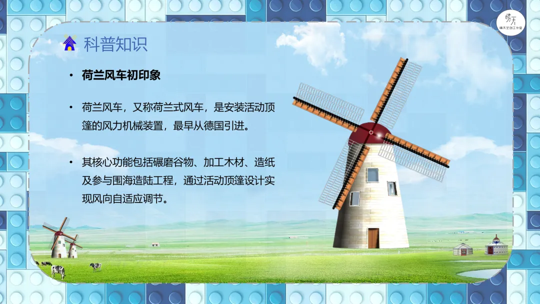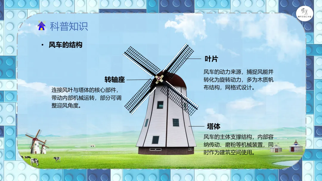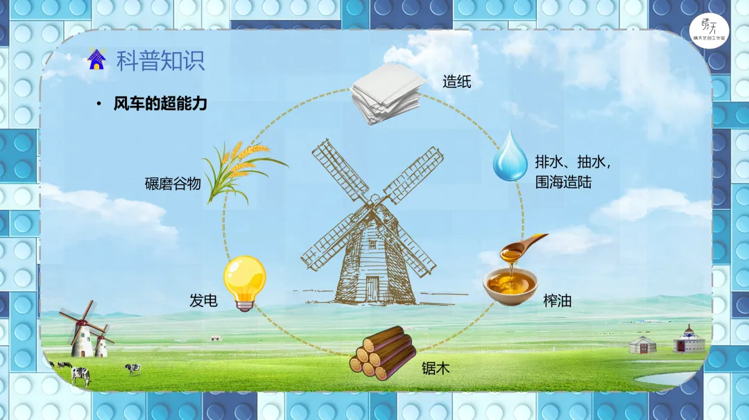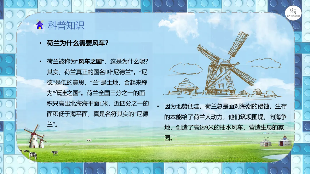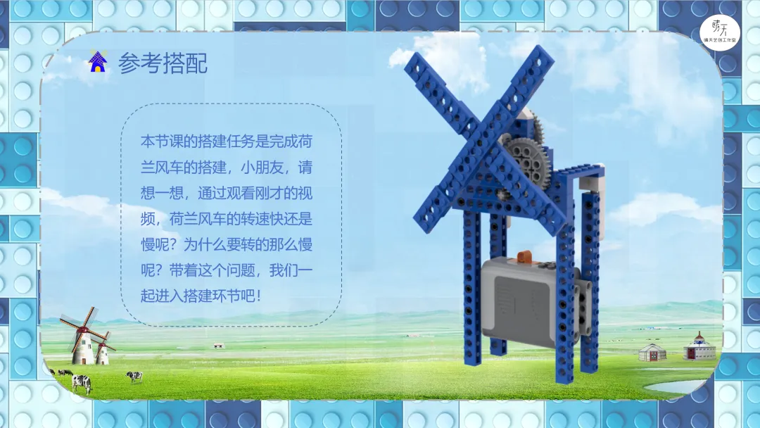 本周孩子们化身风力工程师,用乐高9686套件搭建了充满异国风情的荷兰风车!在动手搭建中,孩子们既了解了荷兰风车的历史文化,又解锁了齿轮二级减速传动机构的机械奥秘。首先,我们认识了风车,了解了荷兰为什么会有那么多风车,以及风车的用途和工作原理;