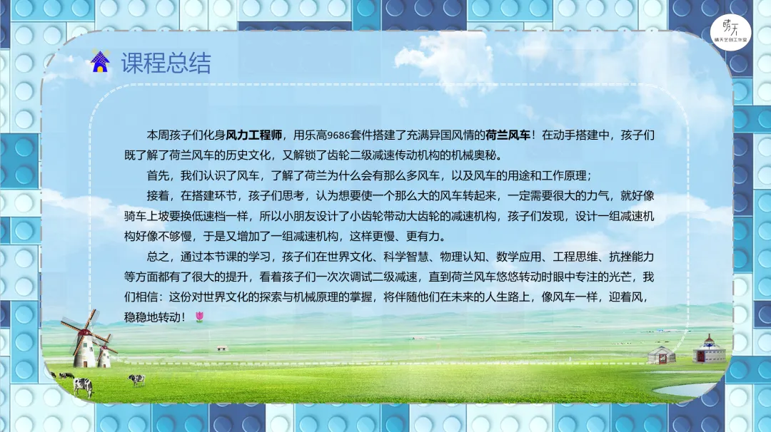 总之,通过本节课的学习,孩子们在世界文化、科学智慧、物理认知、数学应用、工程思维、抗挫能力等方面都有了很大的提升,看着孩子们一次次调试二级减速,直到荷兰风车悠悠转动时眼中专注的光芒,我们相信:这份对世界文化的探索与机械原理的掌握,将伴随他们在未来的人生路上,像风车一样,迎着风,稳稳地转动!🌷