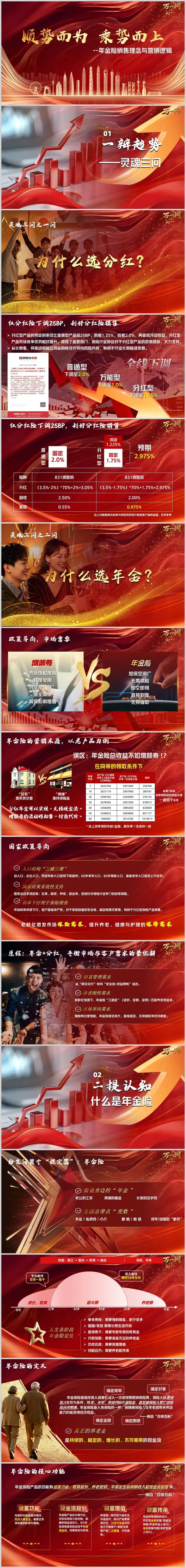 在利率持续下行、人口结构深刻变革、监管政策全面调整的时代背景下,中国保险市场正经历一场静默而深刻的转型。一款名为《分红年金险销售理念国家政策导向核心功能》的培训课件,以其17页的浓缩内容,精准地勾勒出当前保险销售的前沿阵地与核心逻辑。这份材料不仅是一份销售工具,更是一扇窗口,透过它,我们可以窥见保险公司如何解读政策、定义趋势、重塑产品价值,并最终引导一场关于家庭财富与养老规划的观念变革。
