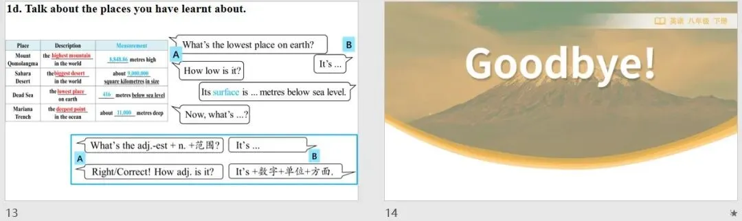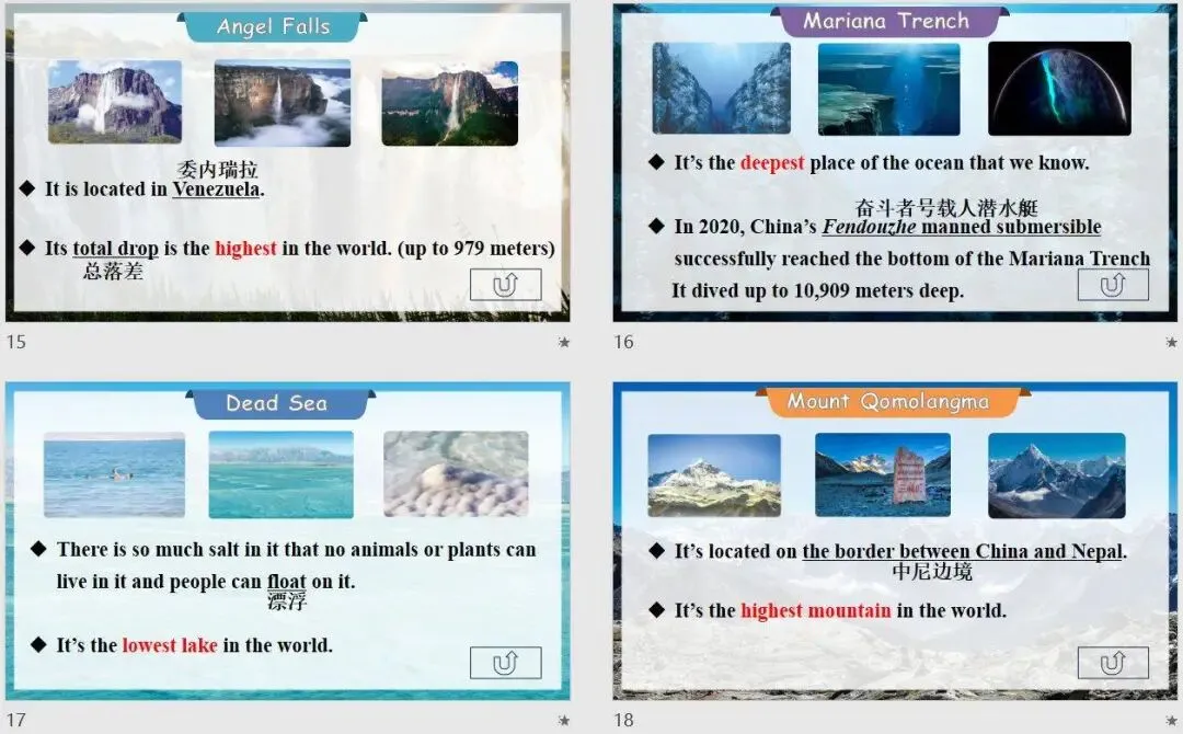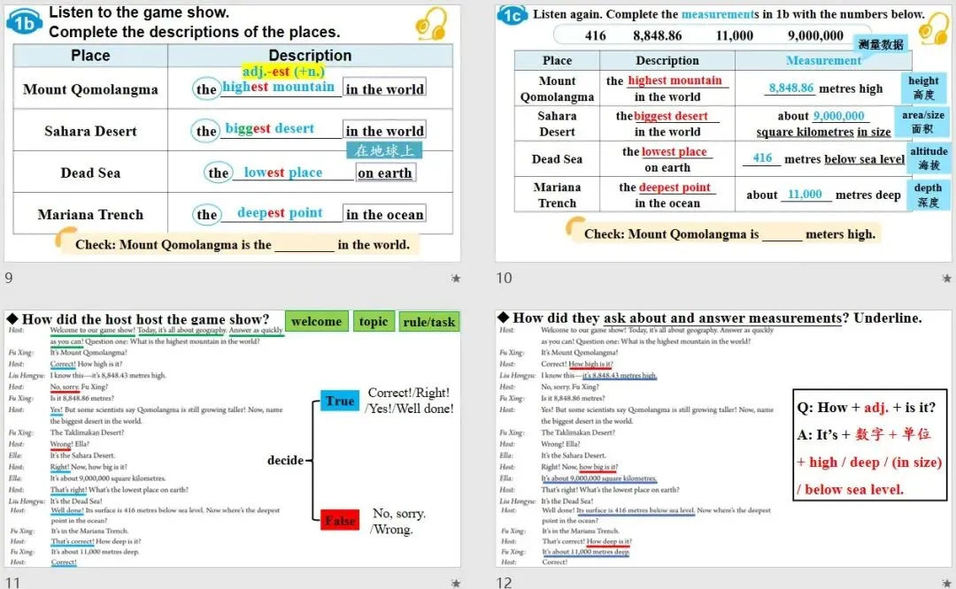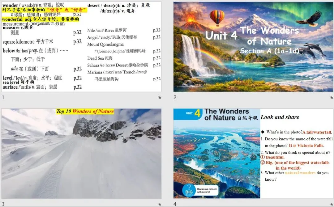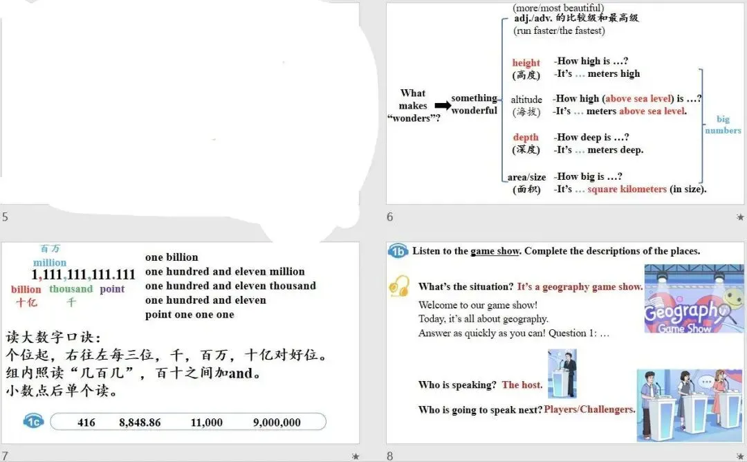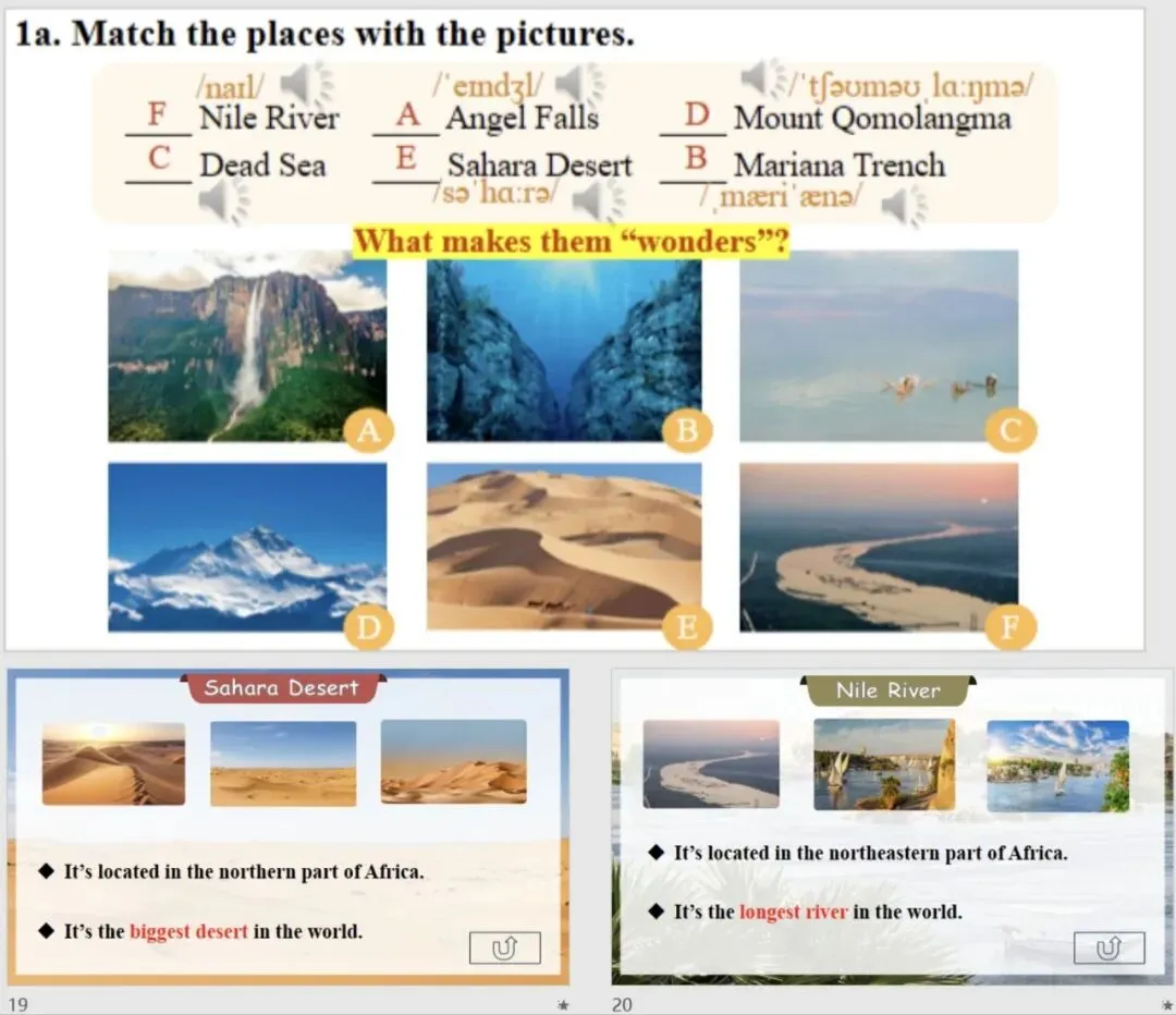 2. 1a:解决发音问题并增进对各奇观的了解(超链接跳转)。然后提问why "wonders", not normal "landscapes"? What makes them wonders? → they have something wonderful→形容词副词比较级和最高级,以及measurements和大数字→教如何读大数字→练习读1c的数字。