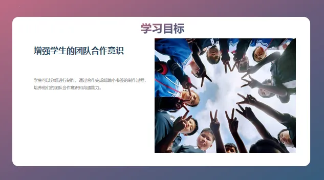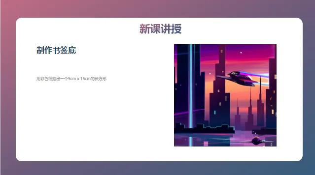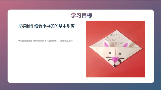 教师出示己做好的各式各样卡纸做的小书签,并给每小组发-一个书签的模型,引导学生仔细观察,研究探讨制作小书签的方法或步骤。