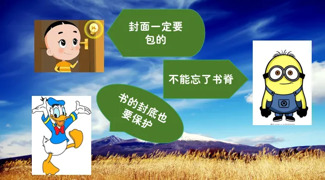 继续按一般包法完成包书程序,则所包的书有一角象是套上一只角,有立体感。依此方法可给底面各套上两角.这样,一个书皮就完成了