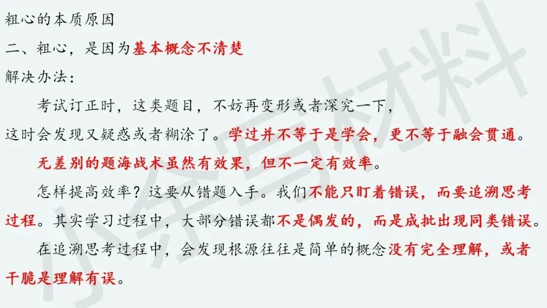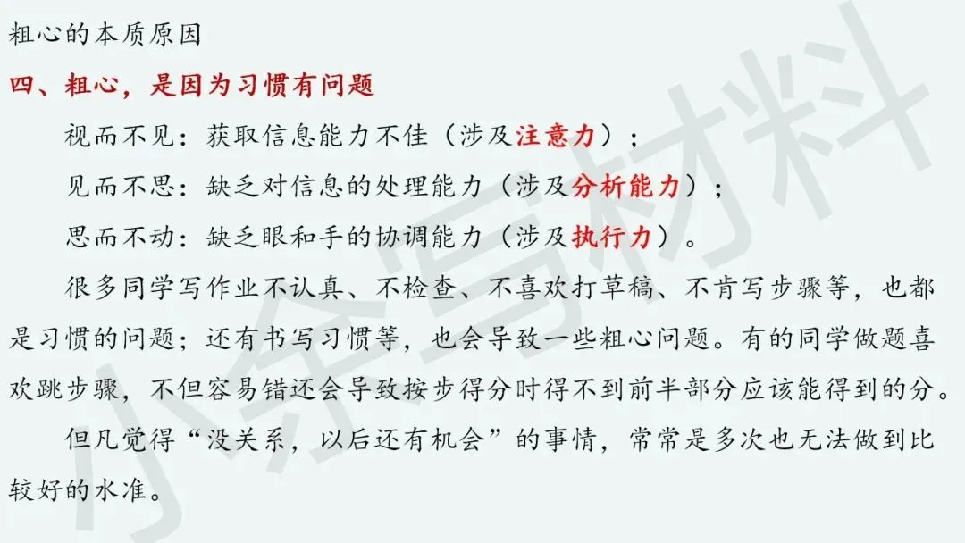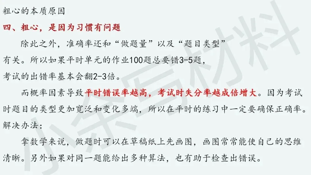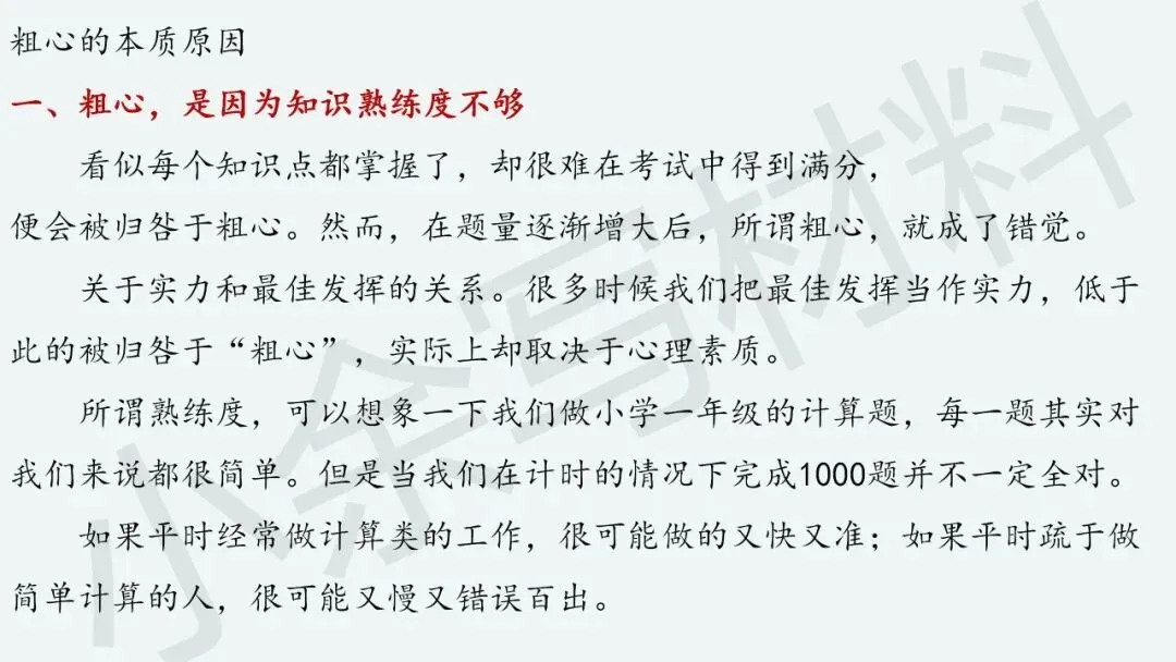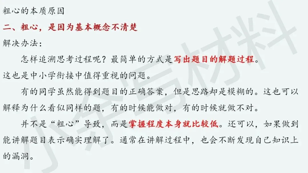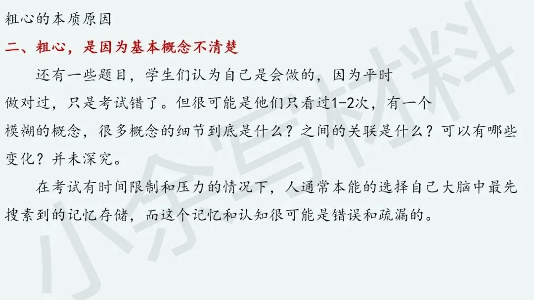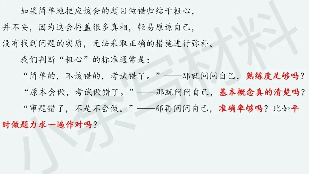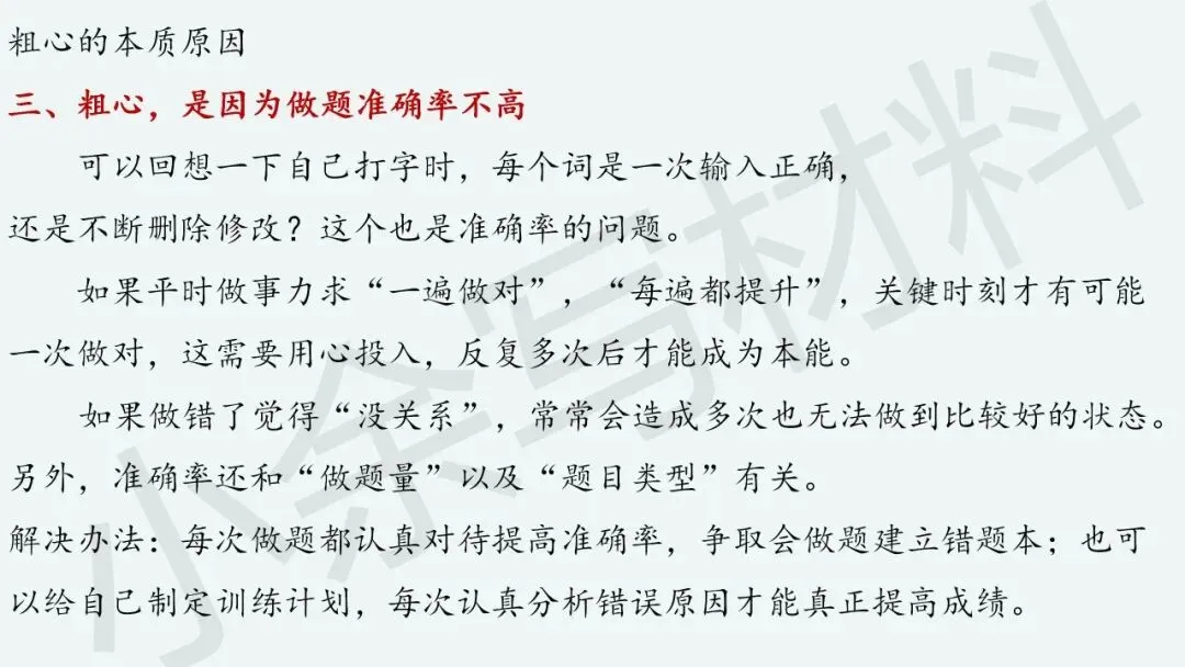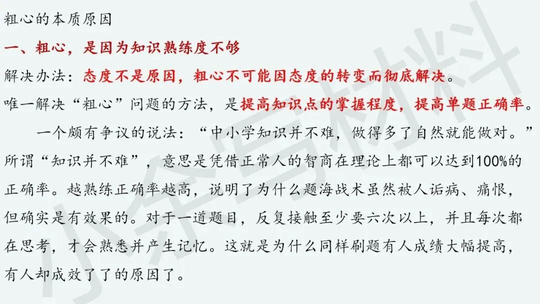 “粗心”本质上反映啥呢?“粗心”是因为知识熟练度不够,“粗心”是因为基本概念不清楚,“粗心”是因为做题准确率不高,“粗心”是因为习惯有问题。