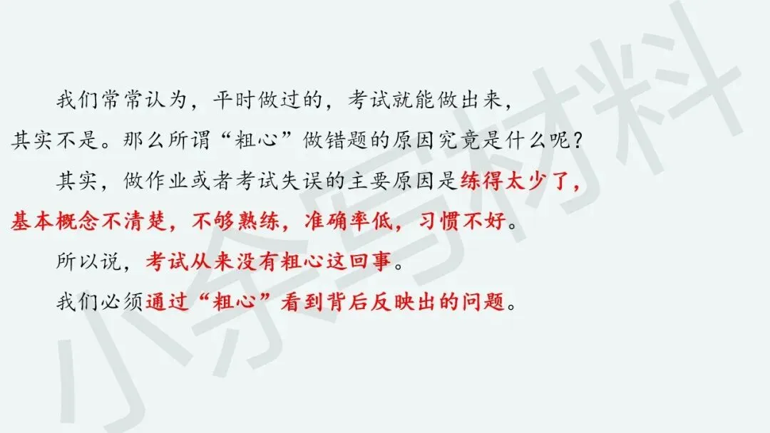 老师有话说哈,考试失误其实不是“粗心”的问题,考试成绩好坏根本和“粗心”没关系,最主要的原因还是练得太少了,因为练得少了,导致基本概念不清楚、不够熟练,准确率低,习惯不好。