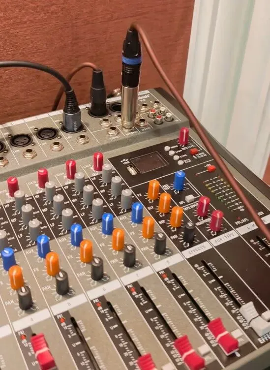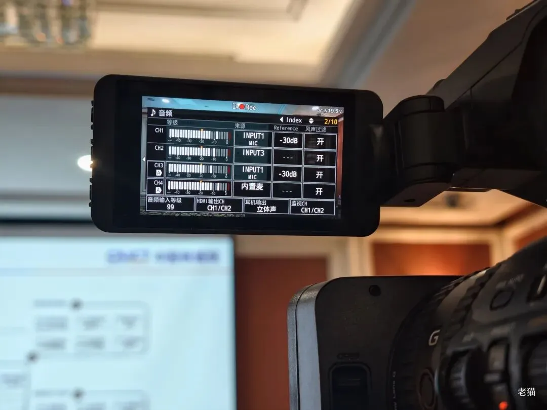 录音1:从调音台AUX 输出接口取音,直接连接摄像机卡侬口,获取会场扩声音频。(1声道和3声道录的调音台声音)