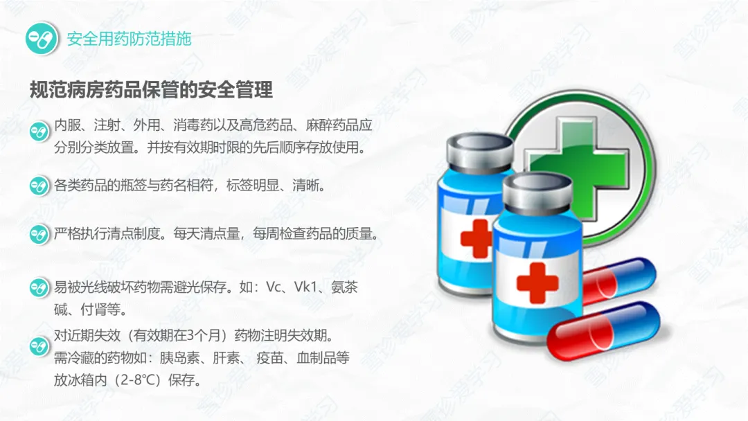 | 病房药品保管规范 | | 严格分区放置;近效期(3个月)醒目标注;胰岛素/肝素等严格2-8℃冷藏。 |