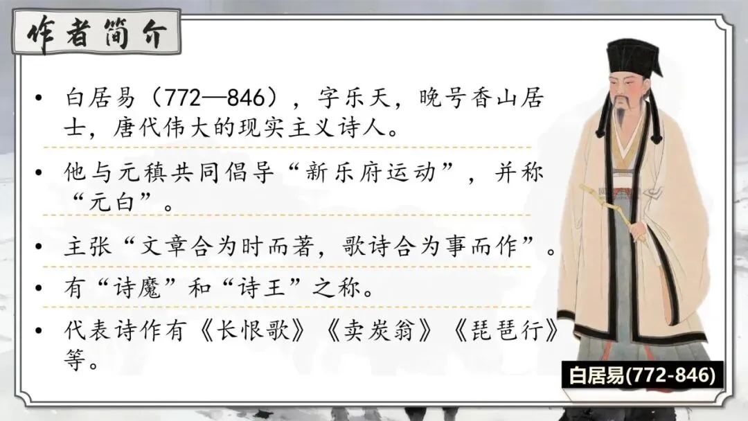 白居易(772—846),字乐天,晚号香山居士,唐代伟大的现实主义诗人。他与元稹共同倡导“新乐府运动”,并称“元白”。主张“文章合为时而著,歌诗合为事而作”。其诗歌题材广泛,形式多样,语言平易通俗。有“诗魔”和“诗王”之称。官至翰林学士、左赞善大夫。代表诗作有《长恨歌》《卖炭翁》《琵琶行》等。