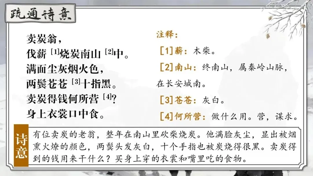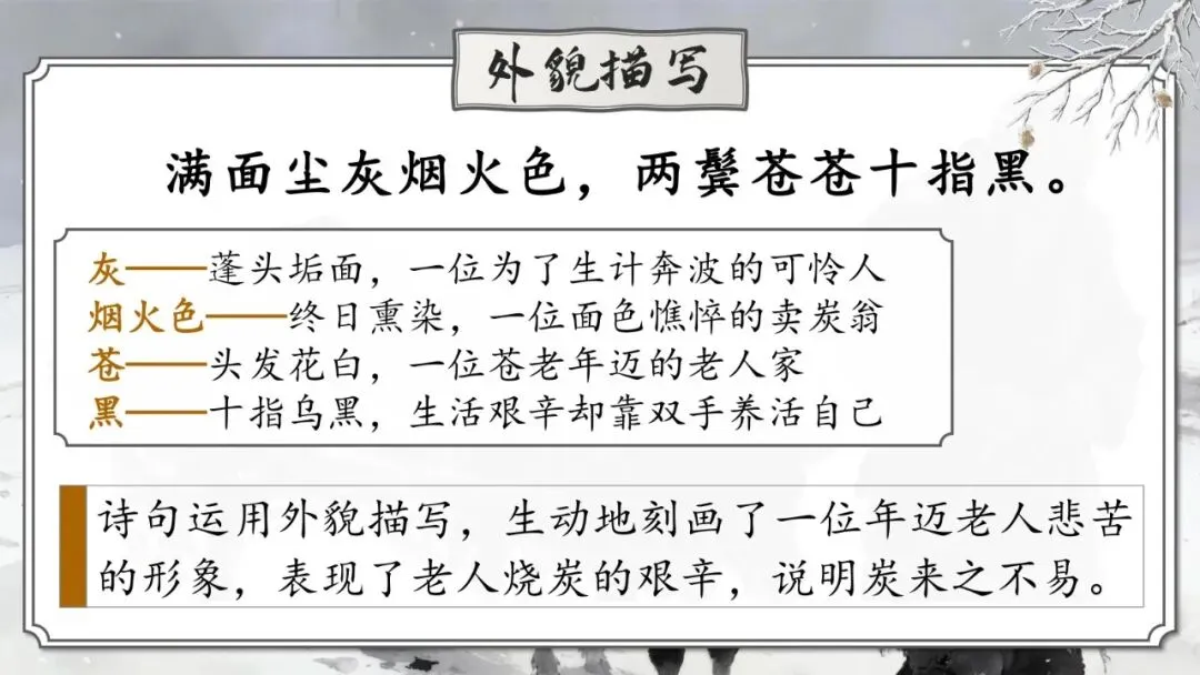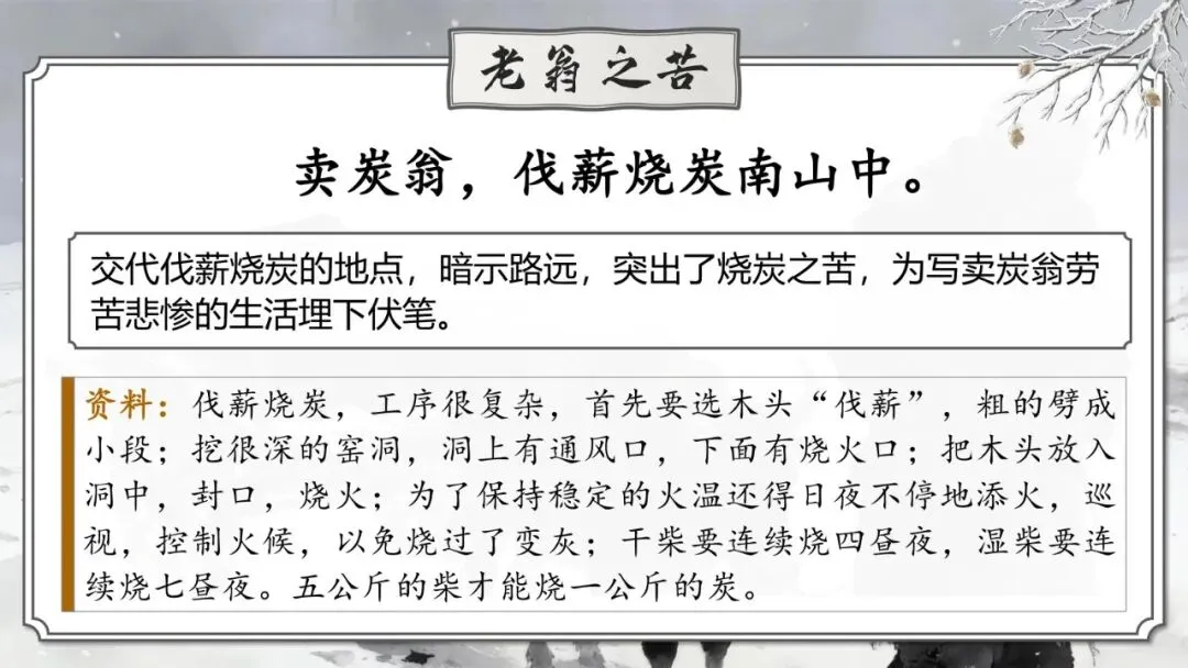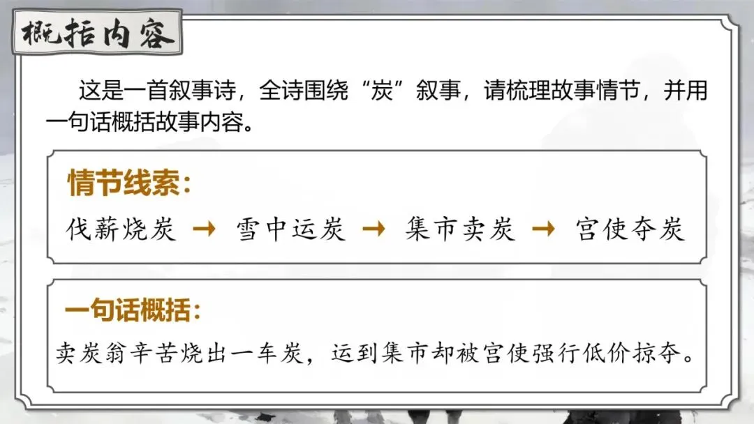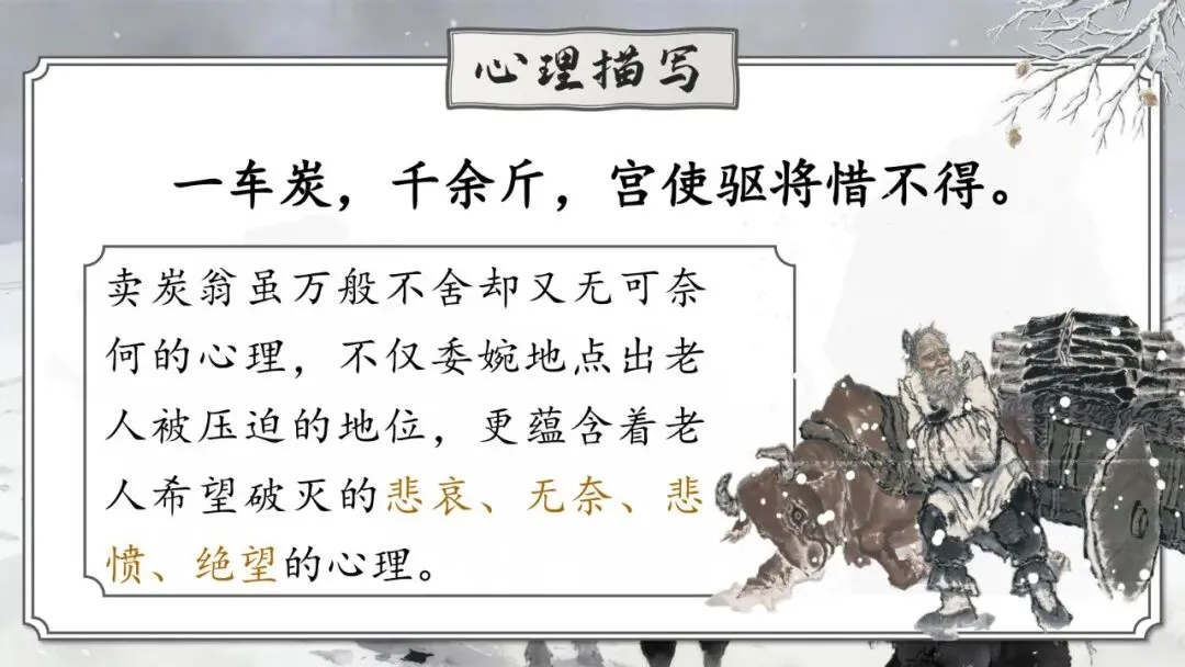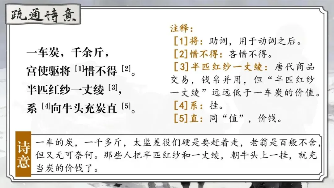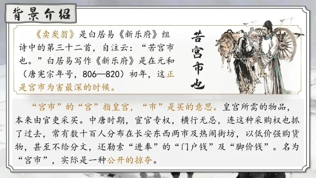《卖炭翁》 | 卖炭老人辛苦烧炭却被强行掠夺 | 中唐“宫市”对底层劳动人民残酷剥削的黑暗现实 | 寓情于事,对比反衬 |