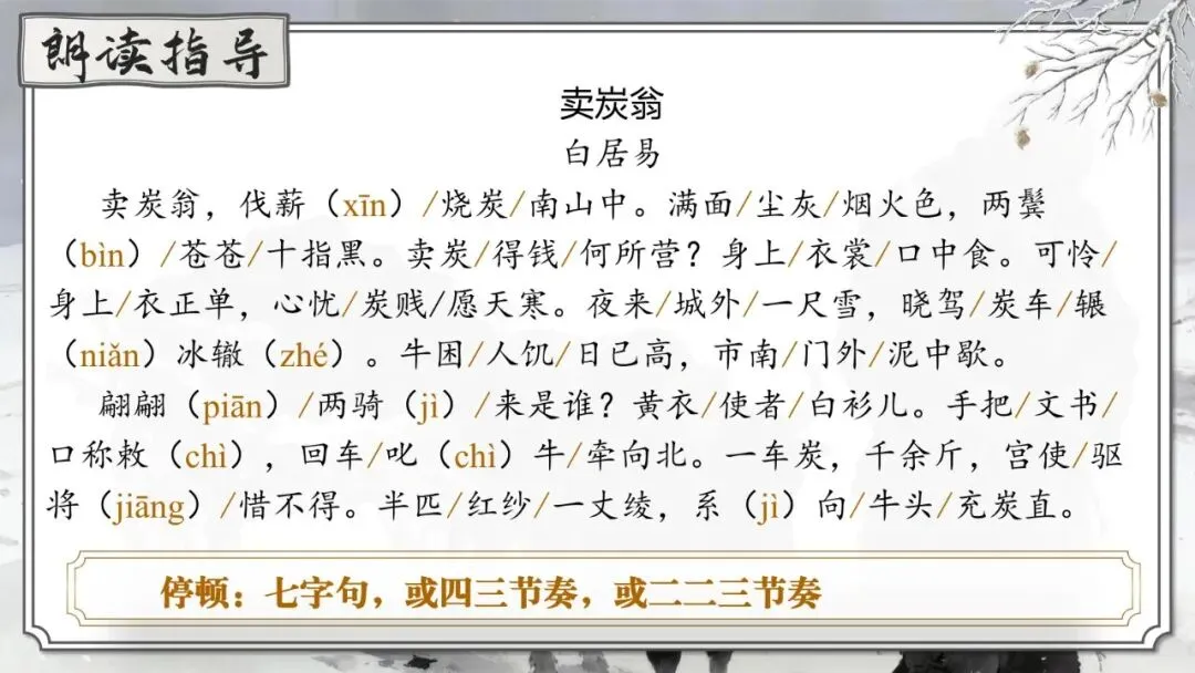 卖炭翁,伐薪(xīn)/烧炭/南山中。满面/尘灰/烟火色,两鬓(bìn)/苍苍/十指黑。卖炭/得钱/何所营?身上/衣裳/口中食。可怜/身上/衣正单,心忧/炭贱/愿天寒。夜来/城外/一尺雪,晓驾/炭车/辗(niǎn)冰辙(zhé)。牛困/人饥/日已高,市南/门外/泥中歇。