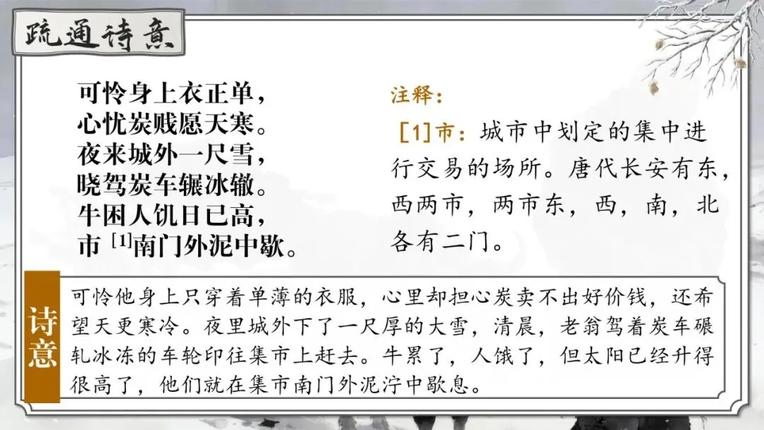 可怜他身上只穿着单薄的衣服,心里却担心炭卖不出好价钱,还希望天更寒冷。夜里城外下了一尺厚的大雪,清晨,老翁驾着炭车碾轧冰冻的车轮印往集市上赶去。牛累了,人饿了,但太阳已经升得很高了,他们就在集市南门外泥泞中歇息。