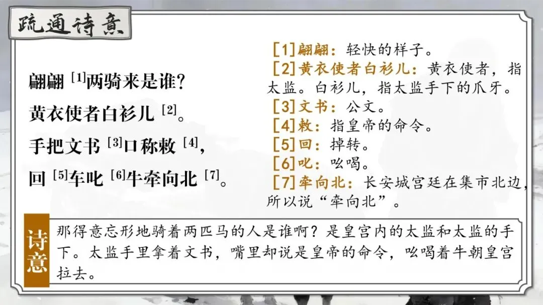 (3)翩翩[1]两骑来是谁?黄衣使者白衫儿[2]。手把文书[3]口称敕[4],回[5]车叱[6]牛牵向北[7]。