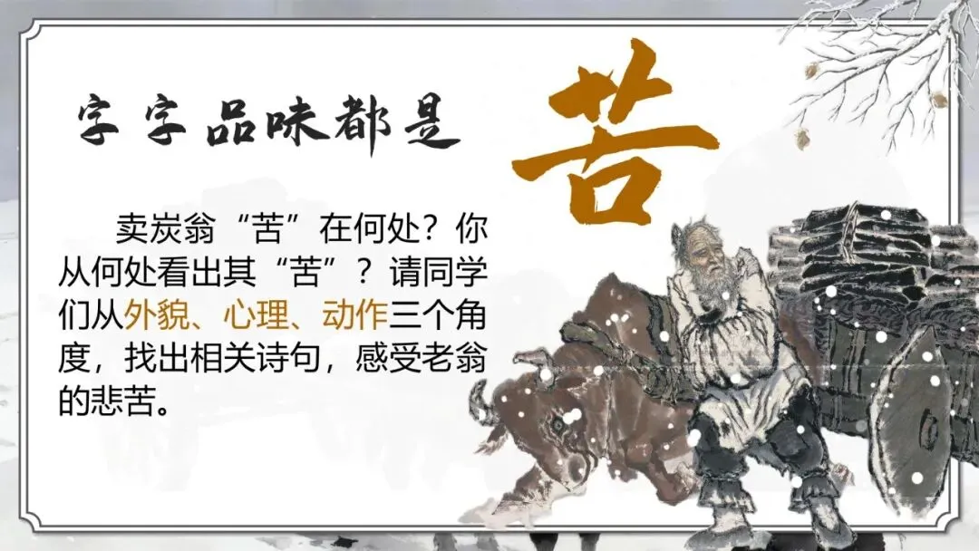 这首诗发表后,时人评论“字字品味都是苦”。卖炭翁“苦”在何处?你从何处看出其“苦”?请同学们从外貌、心理、动作三个角度,找出相关诗句,感受老翁的悲苦。