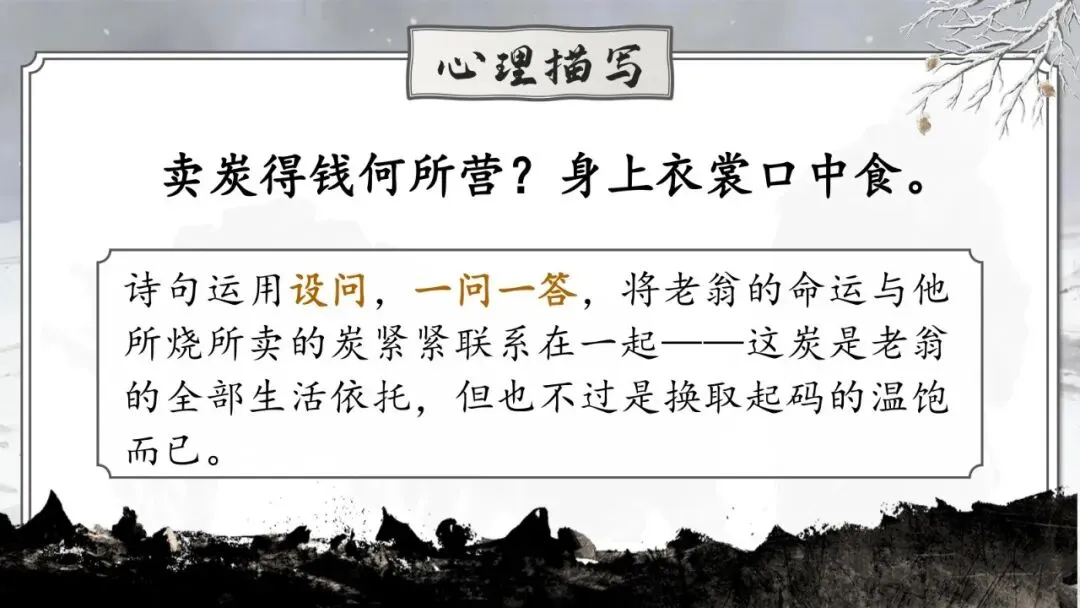 运用设问,一问一答,将老翁的命运与他所烧所卖的炭紧紧联系在一起——这炭是老翁的全部生活依托,但也不过是换取起码的温饱而已。
