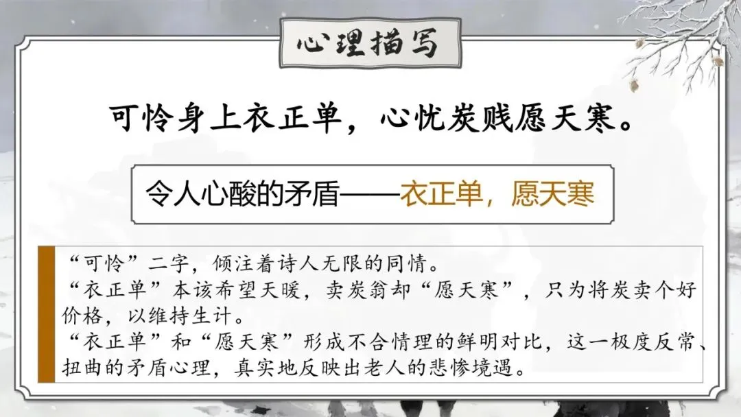 “可怜”二字,倾注着诗人无限的同情。“衣正单”本该希望天暖,卖炭翁却“愿天寒”,只为将炭卖个好价格,以维持生计。“衣正单”和“愿天寒”形成不合情理的鲜明对比,这一极度反常、扭曲的矛盾心理,真实地反映出老人的悲惨境遇。