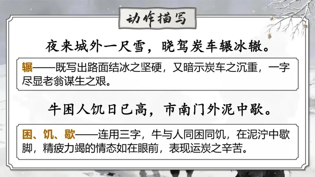 辗——既写出路面结冰之坚硬,又暗示炭车之沉重,一字尽显老翁谋生之艰。
