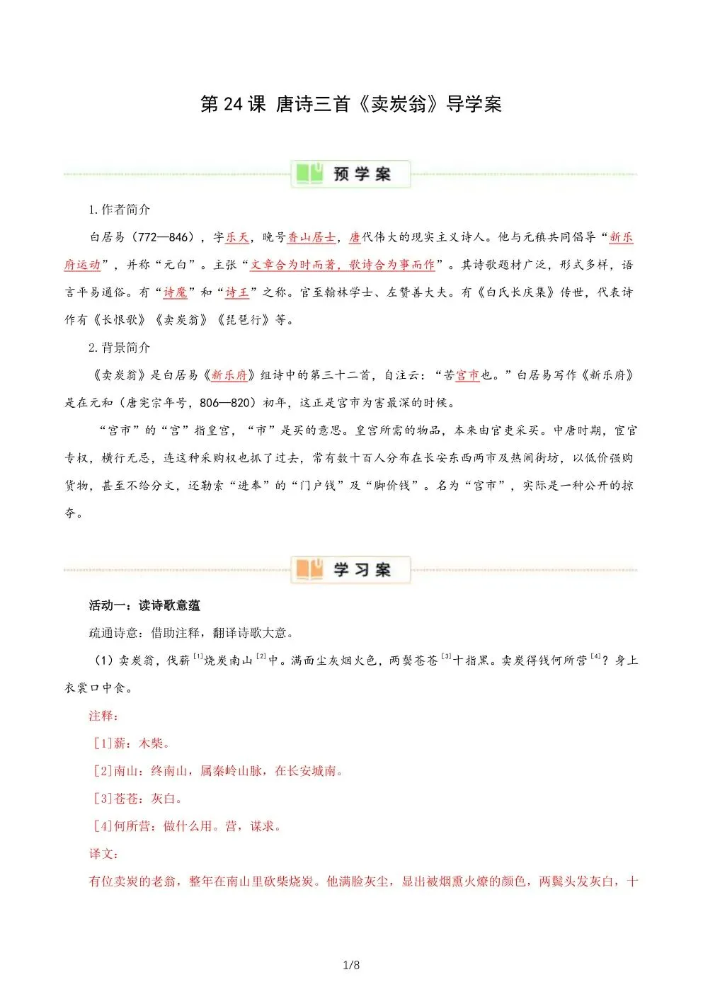(1)卖炭翁,伐薪[1]烧炭南山[2]中。满面尘灰烟火色,两鬓苍苍[3]十指黑。卖炭得钱何所营[4]?身上衣裳口中食。
