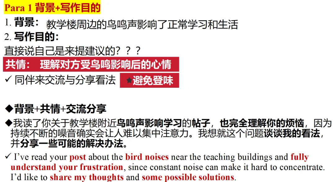 最后在写句子的时候再次提醒同学们,回贴人只是个同学,应该跟发帖人统一战线,